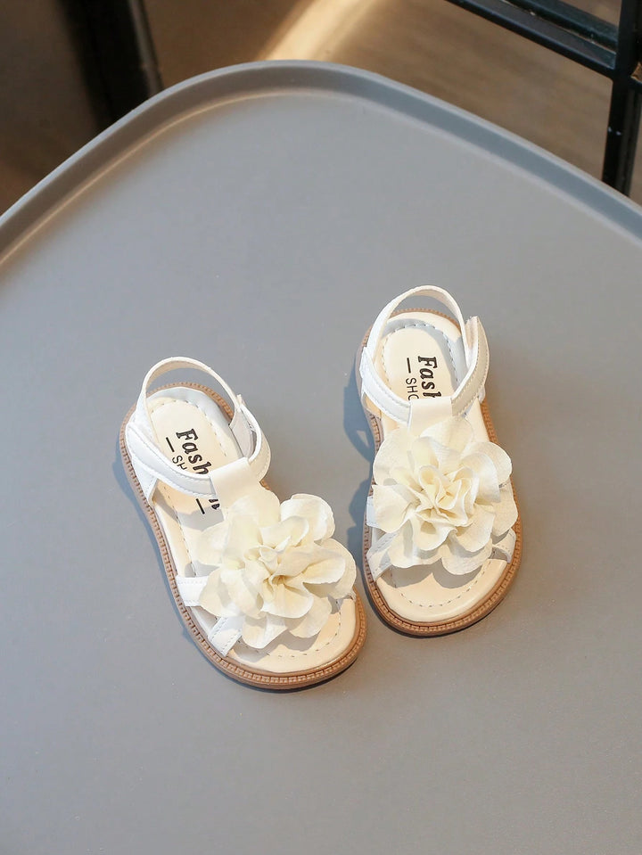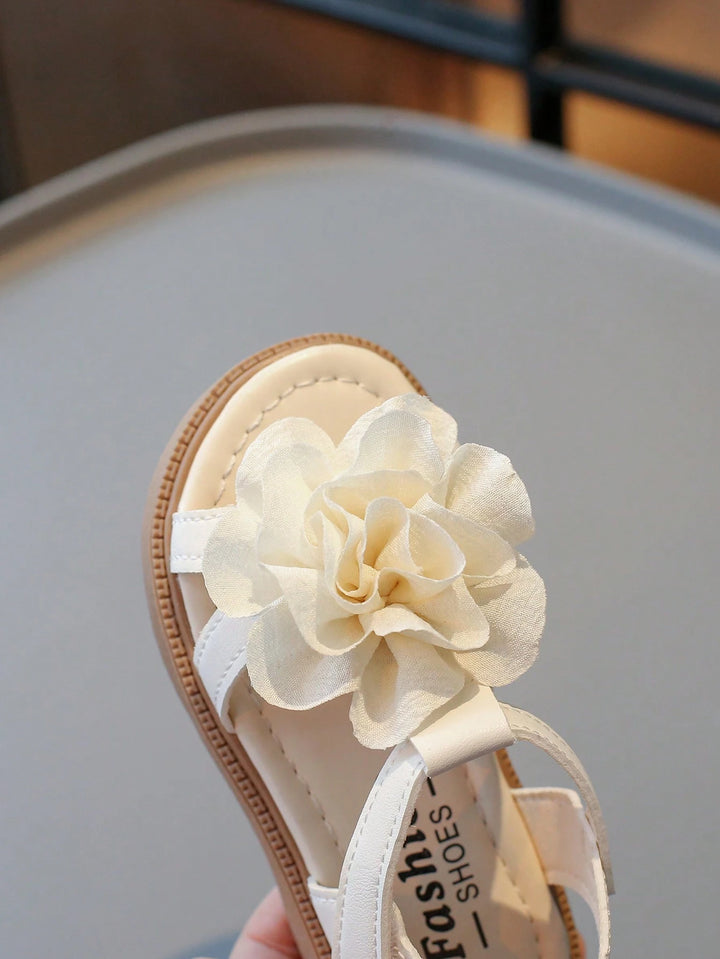 1 Pair Girls Solid Color Leather Open Toe Flower Decor Flat Sandals