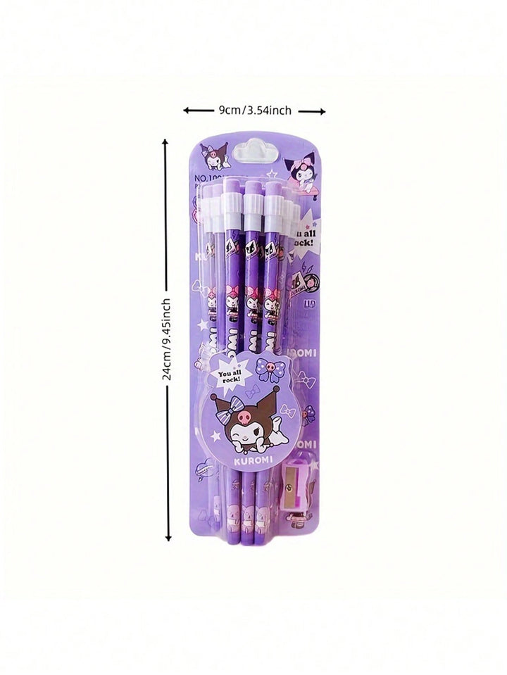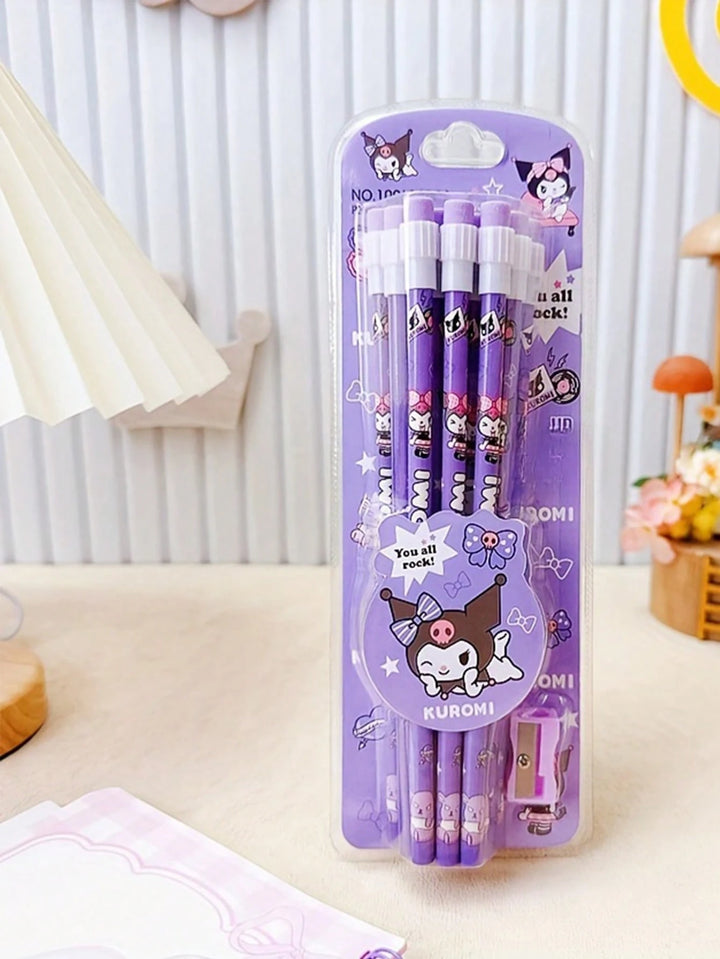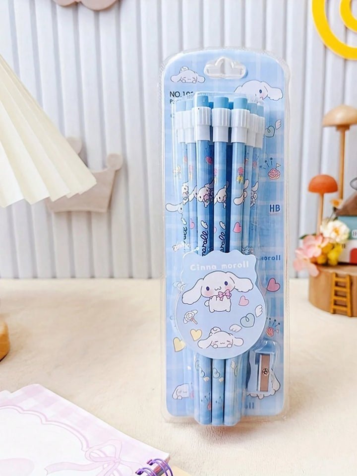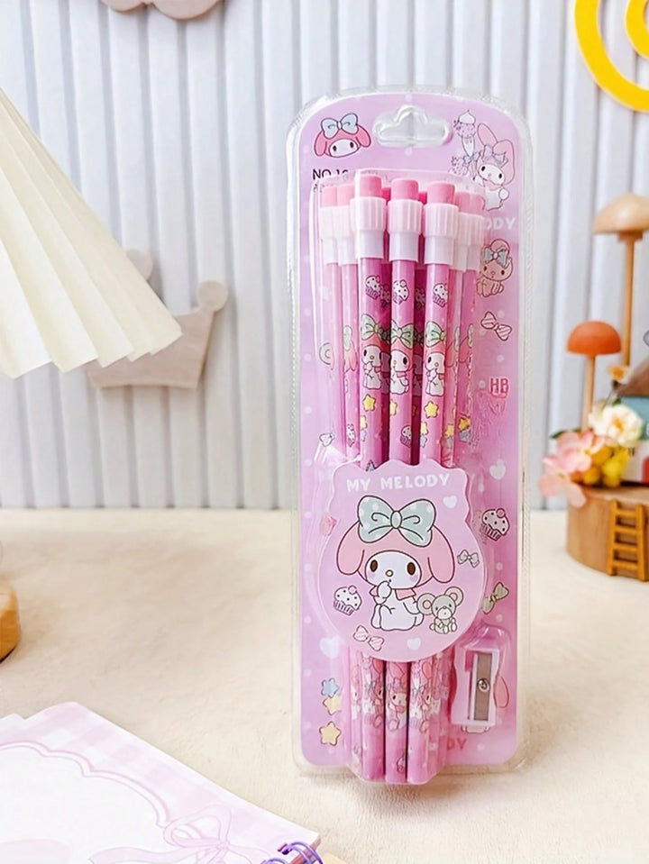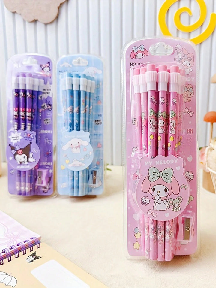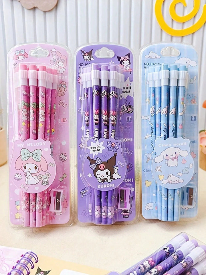12pcs/1set Sanrio Cute Cartoon Wooden Pencil With Eraser Tip Round Barrel