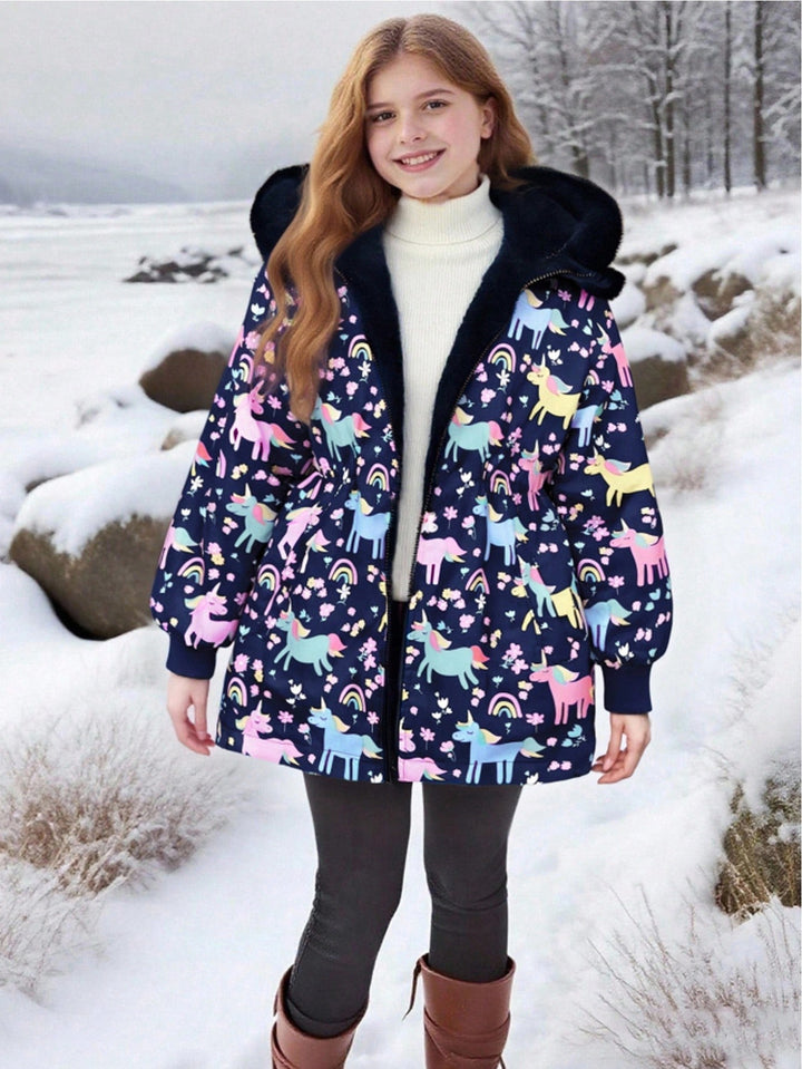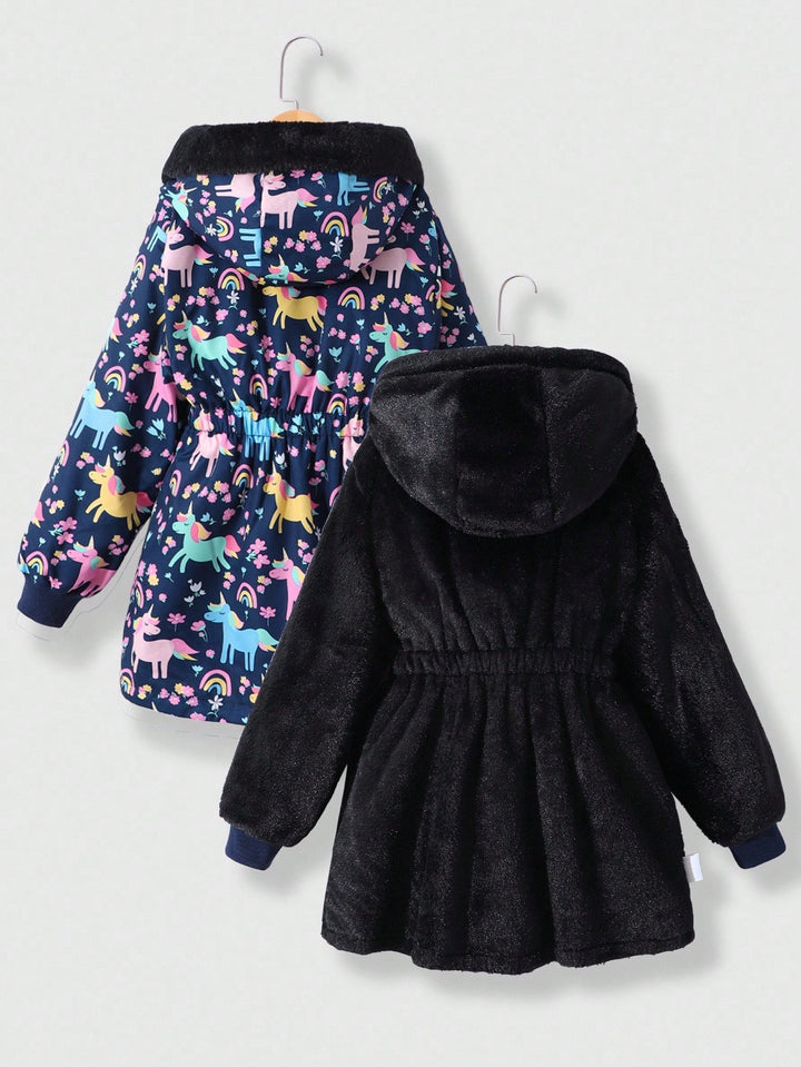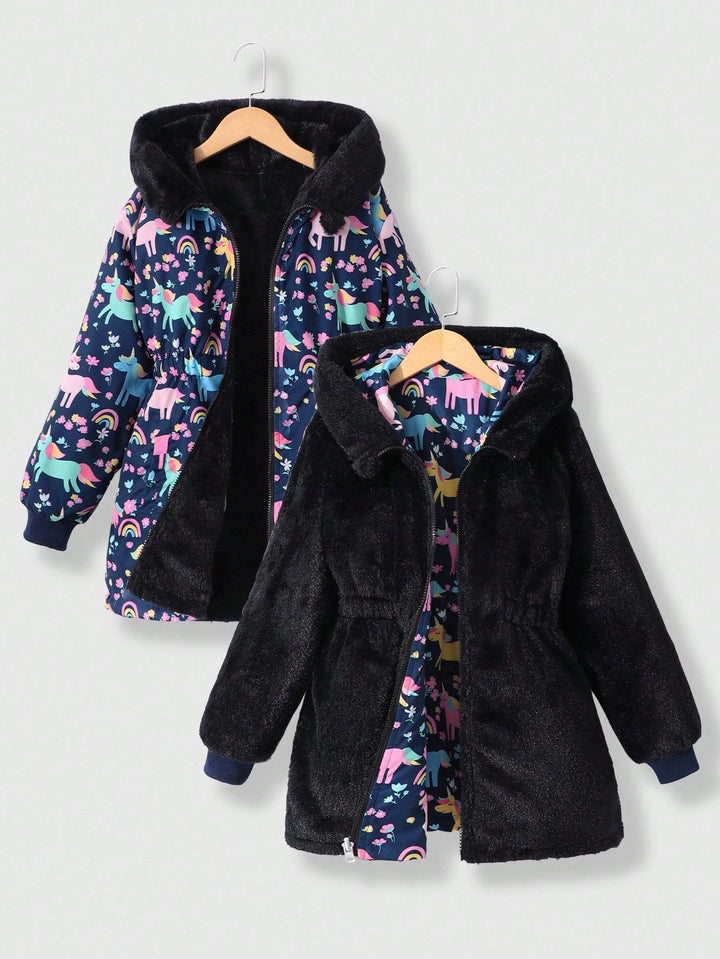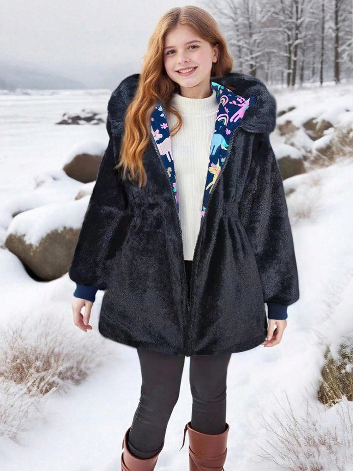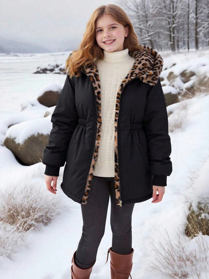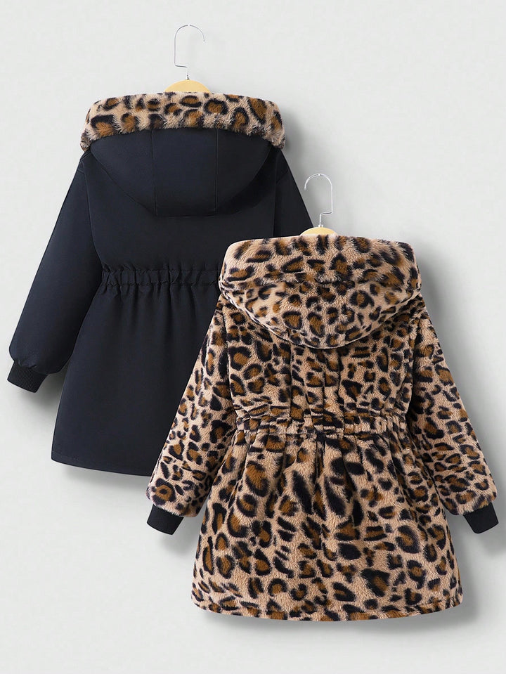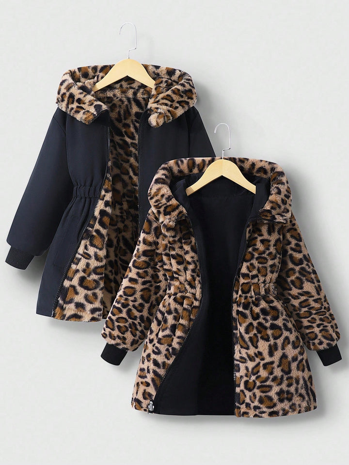 1pc Girls' Leopard Print Reversible Fluffy Long Sleeve Windbreaker Jacket