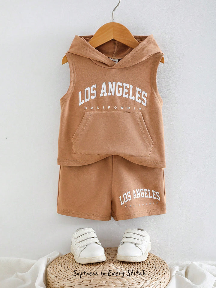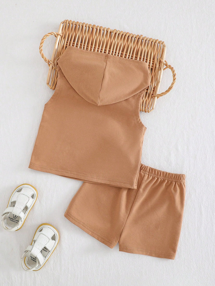 2pcs Baby Boy Letter Pattern Soft Knit Hoodie Vest Top And Elastic Waist Shorts