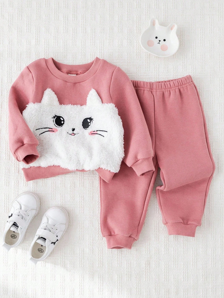 2pcs Baby Girl Cartoon Cat Patchwork Soft Knit Crew Neck Long Sleeve Sweatshirt And Elastic Waist Pants
