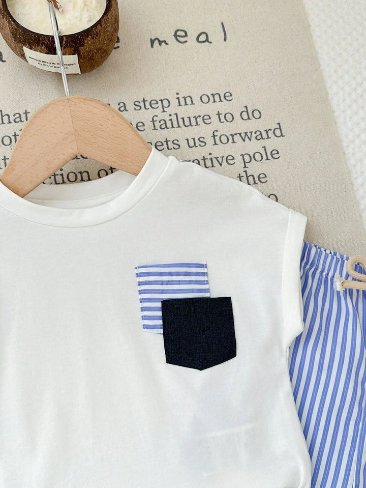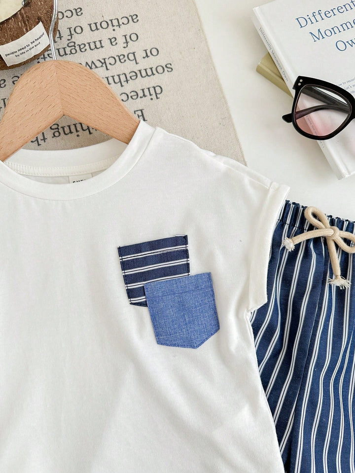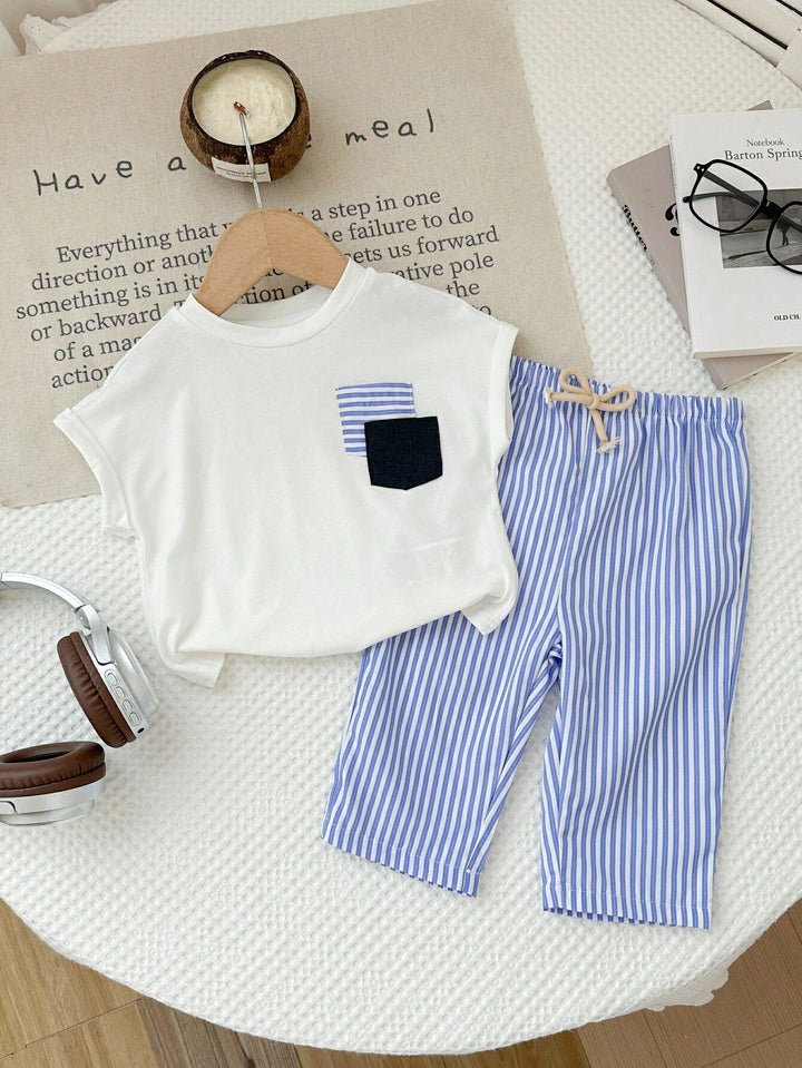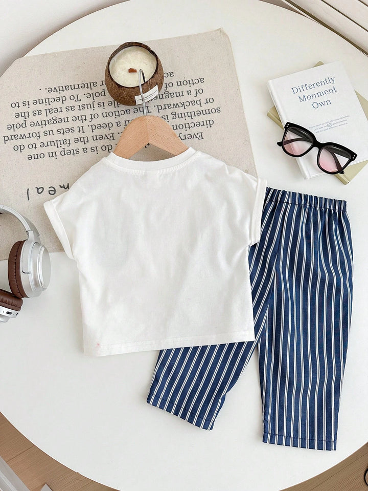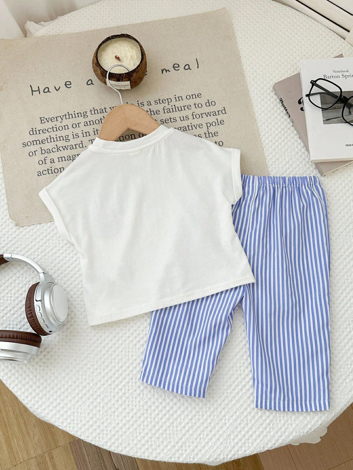 2pcs/Set Baby Boy/Girl Cute Summer Knit White Short Sleeve T-Shirt And Striped Elastic Waist Pants