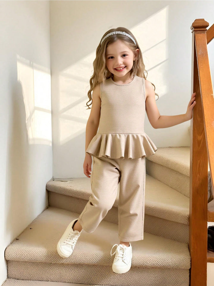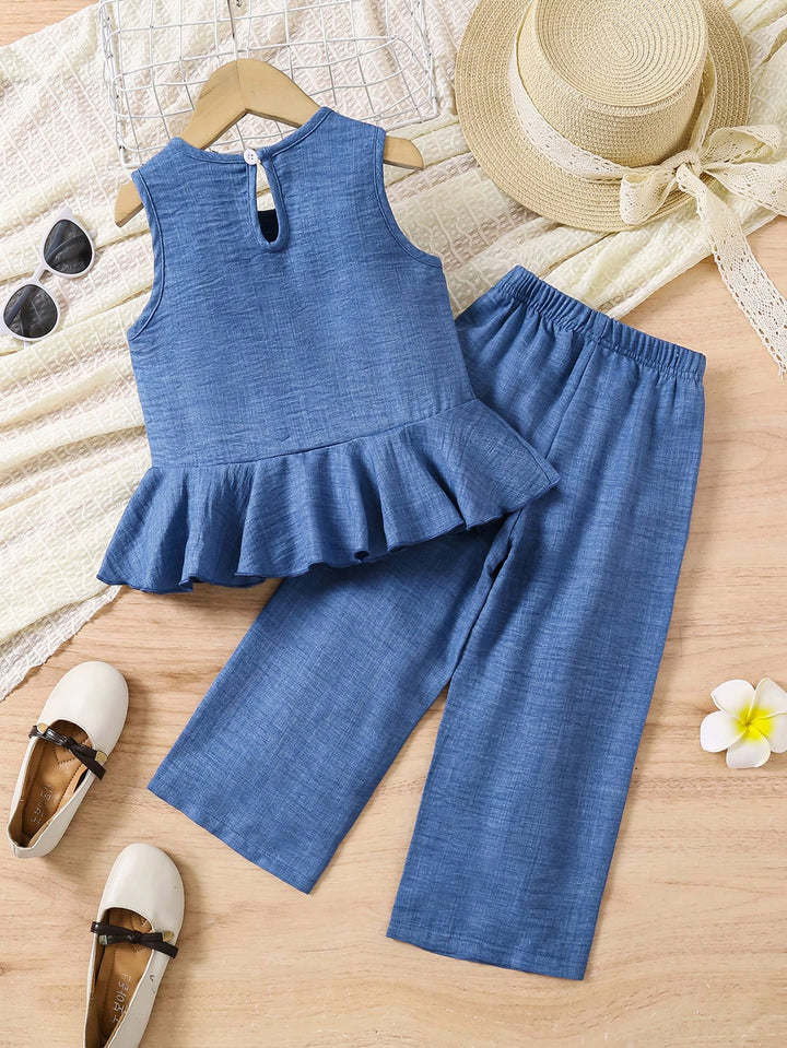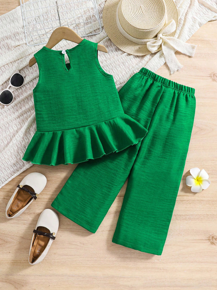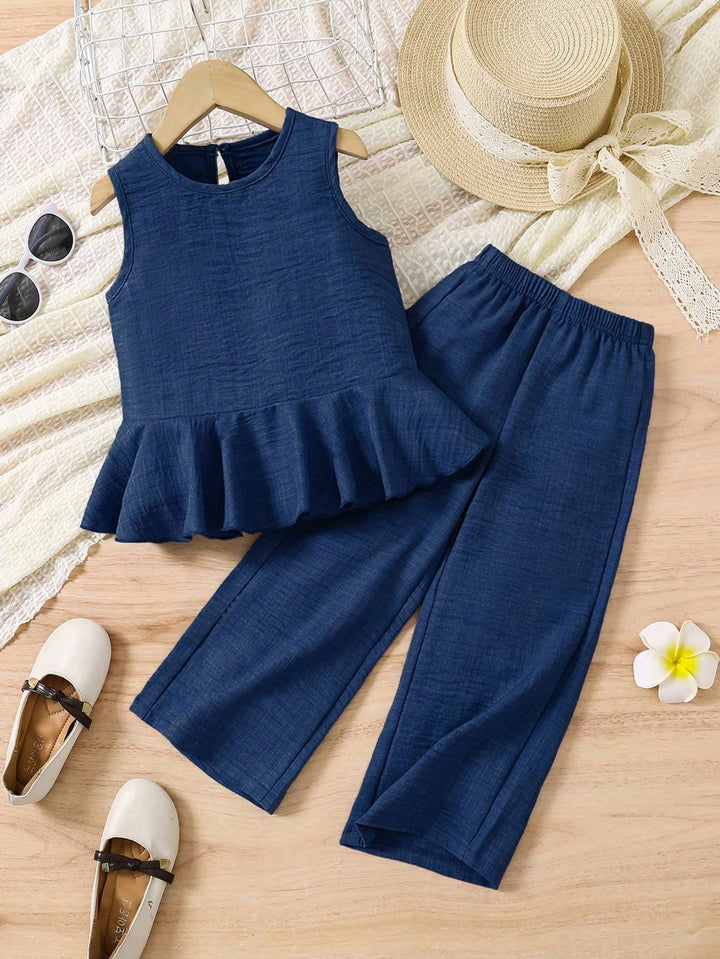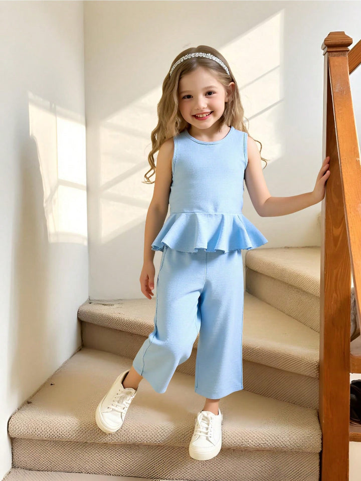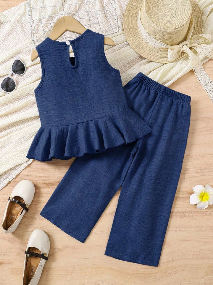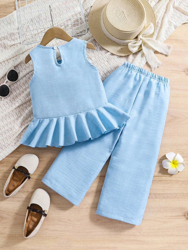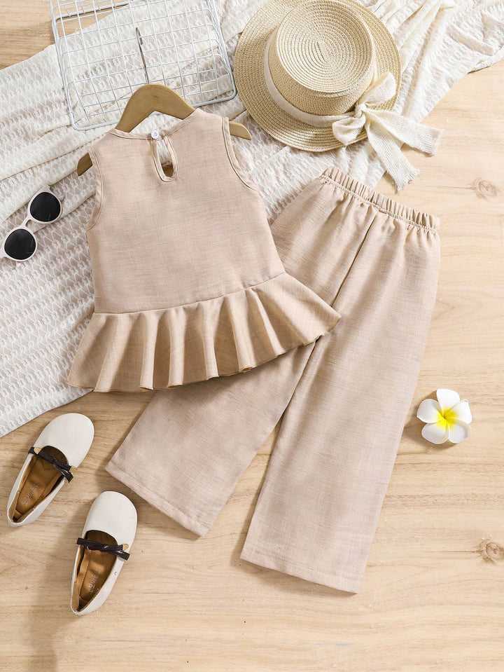 2pcs Young Girl Beach Vacation Set: Sleeveless Ruffle Hem Blouse + Wide Leg Pants