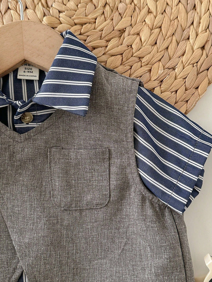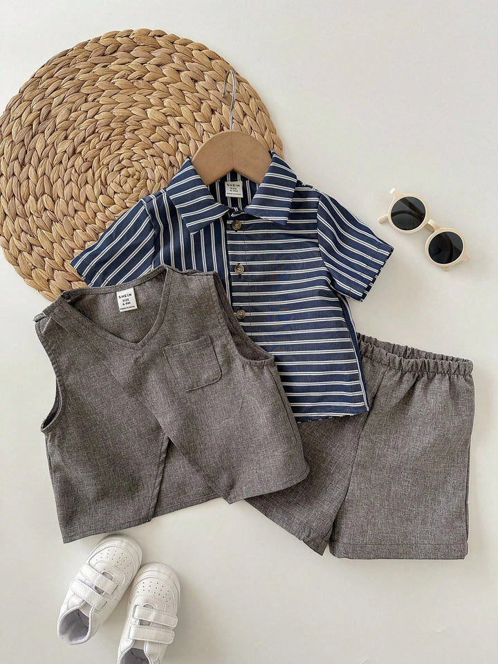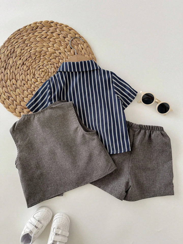 3pcs/Set Baby Boy Casual Gentleman Outfit, Grey Vest With Elastic Waist Shorts