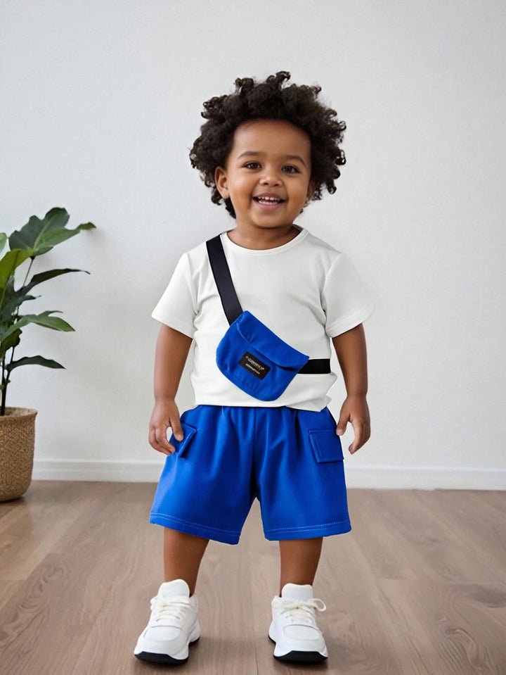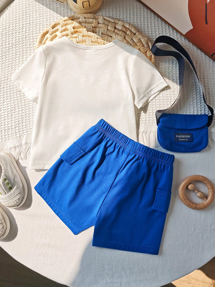 3Pcs Set: White T-Shirt, Blue Cargo Shorts, And Messenger Bag