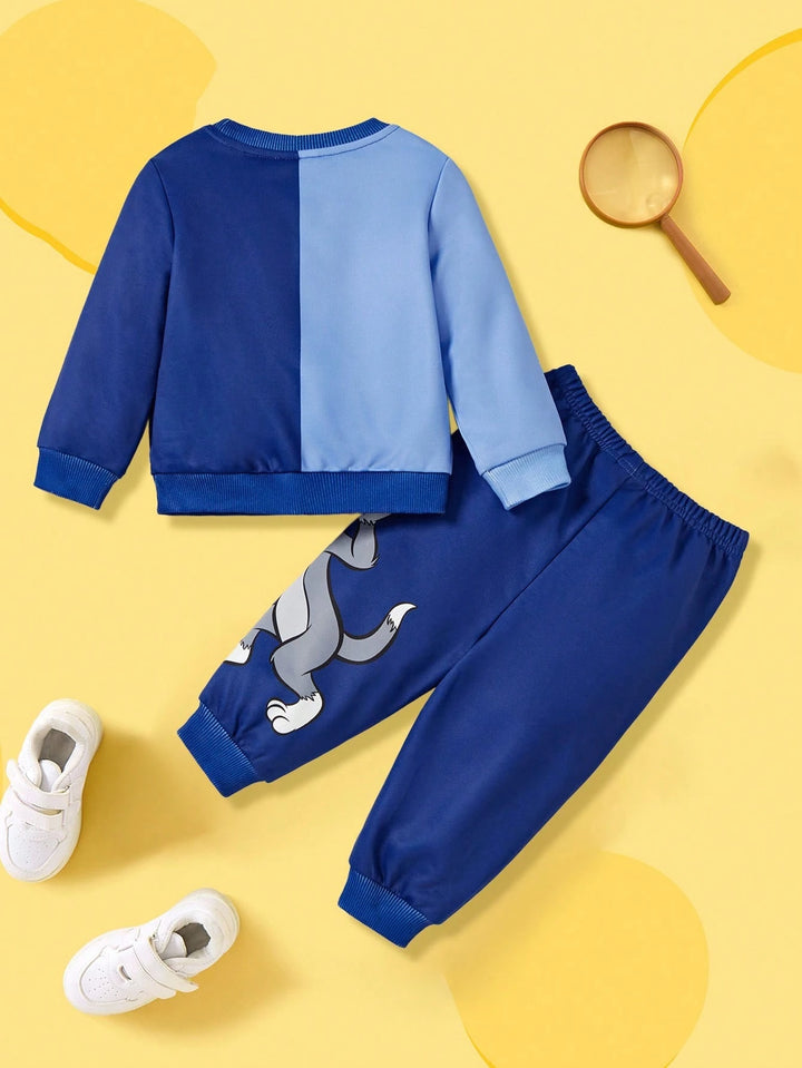 Baby Boy Cartoon Animal Cat & Mouse Print Patchwork Sweatshirt And Sweatpants