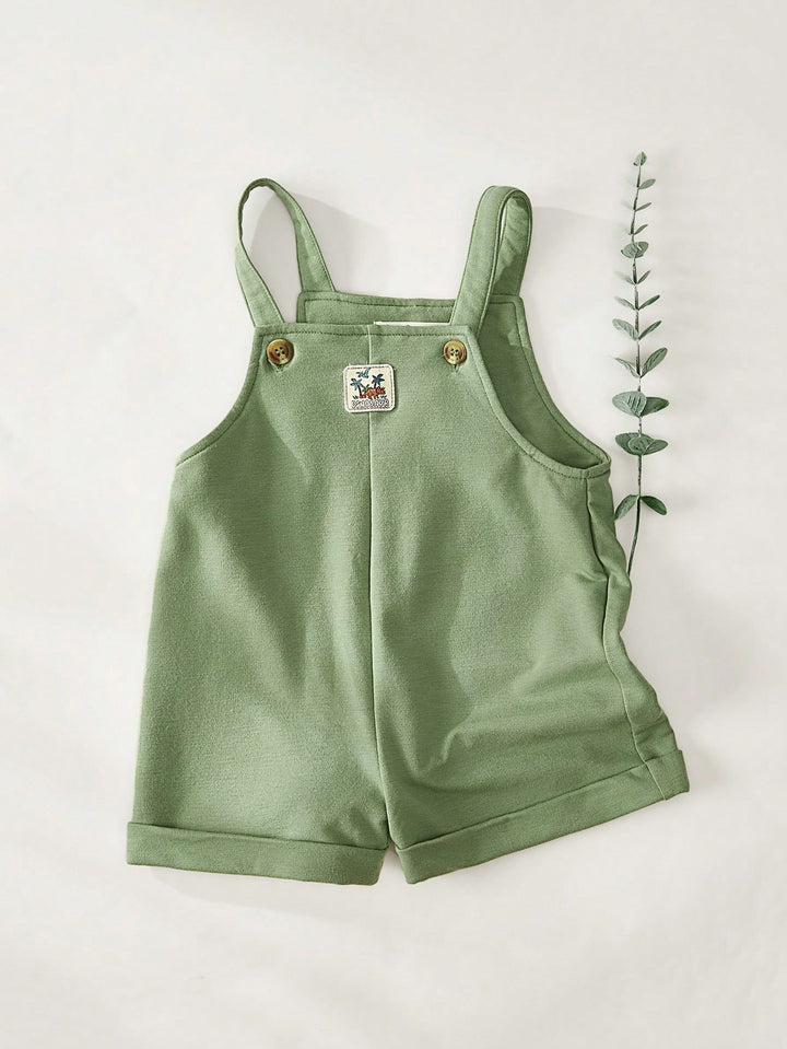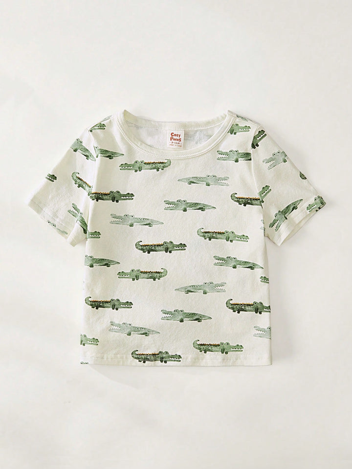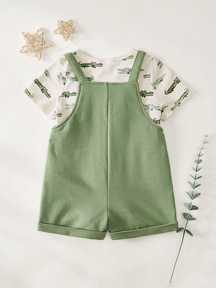 Baby Boy Cartoon Crocodile Print Soft Knit Crew Neck Short Sleeve Pullover Top And Bib Pants