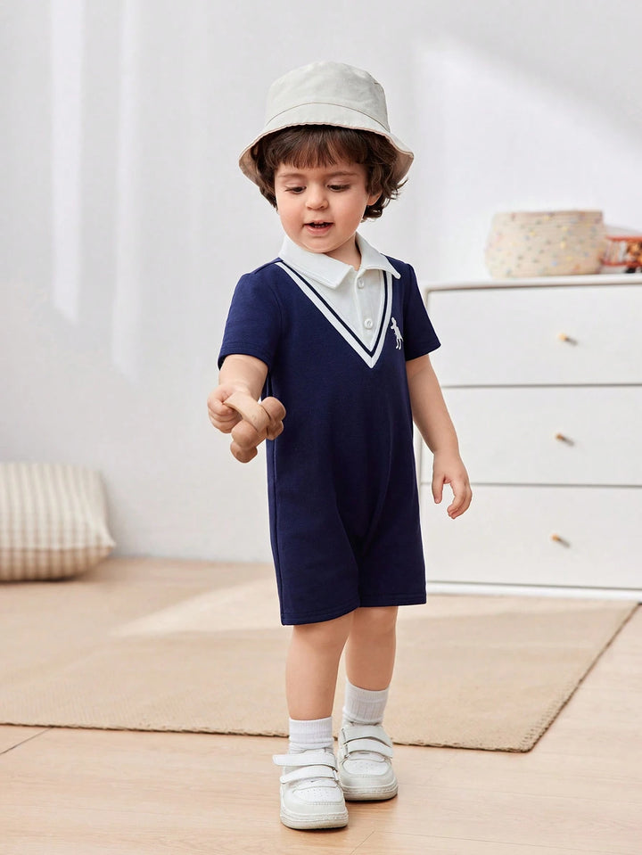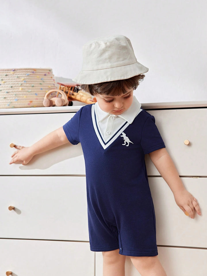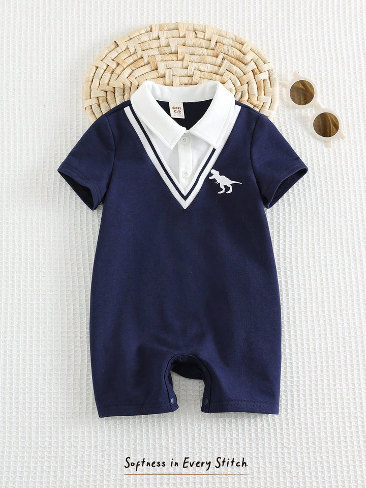 Baby Boy Cartoon Dinosaur Pattern Knitted Soft Contrast Color Lapel Short Sleeve Romper