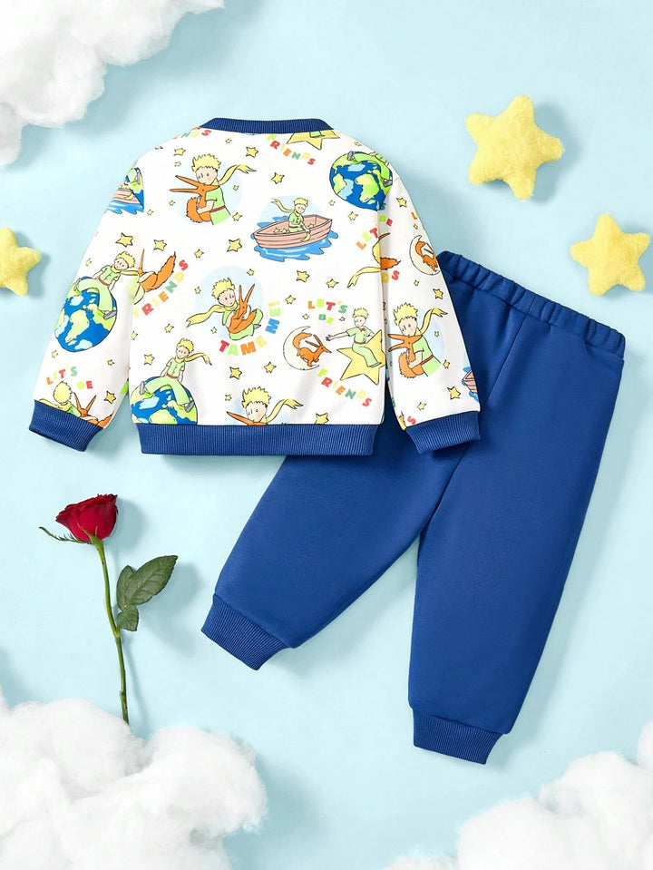 Baby Boy Cartoon Planet & Fox Print Cute Casual Long Sleeve Crew Neck Sweatshirt And Blue Pants