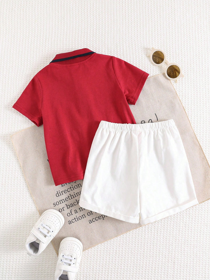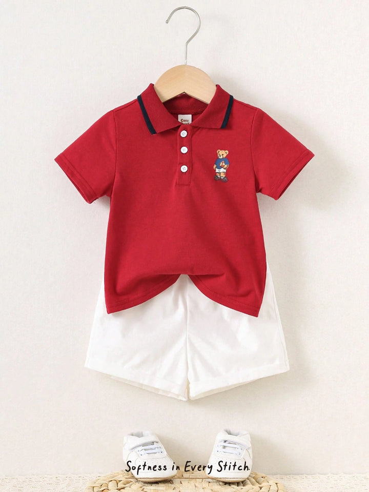 Baby Boy Cartoon Print Soft Knit Polo Collar Snap Button Shirt And Elastic Waist Shorts