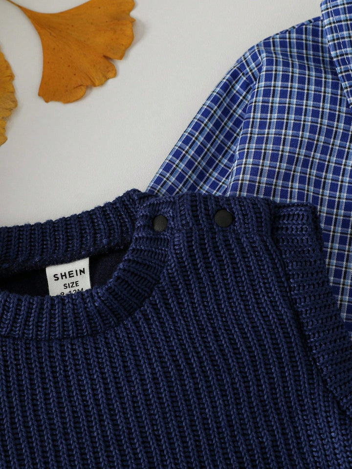 Baby Boy College Style Long Sleeve Shirt, Contrast Color Pants And Embroidered Pony Knitted Vest
