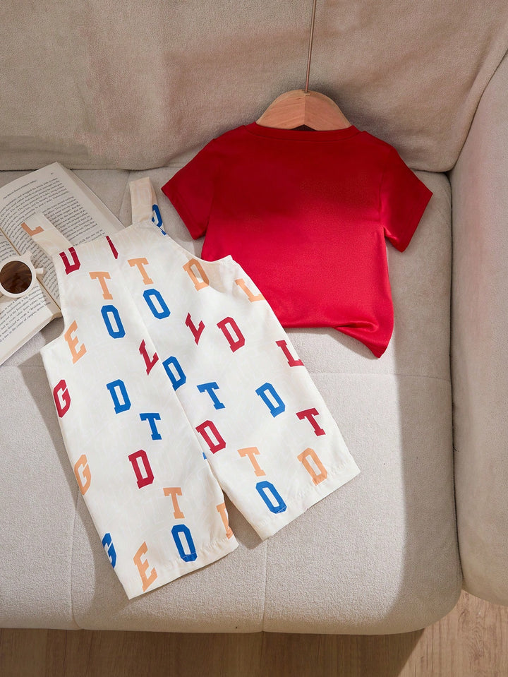 Baby Boy Cute Puppy Pattern Print Bib Overalls Set With Blue T-Shirt
