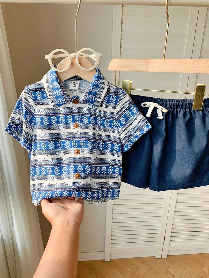 Baby Boys Casual Geometric Pattern Short Sleeve Shirts With Elastic Waist Shorts
