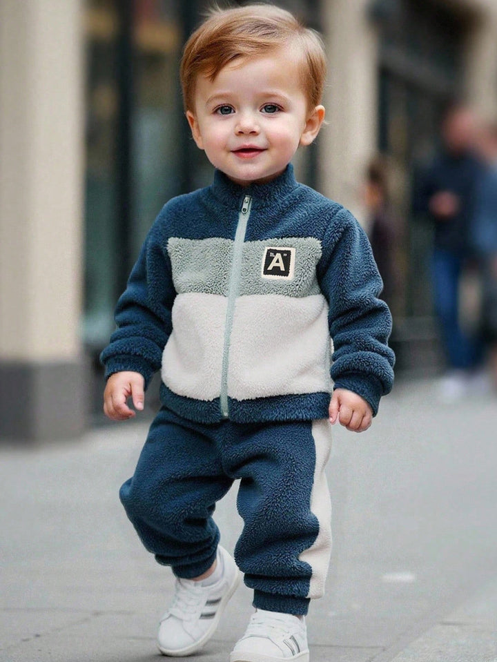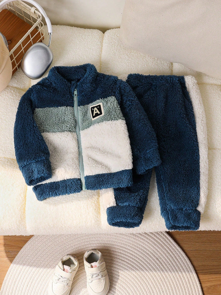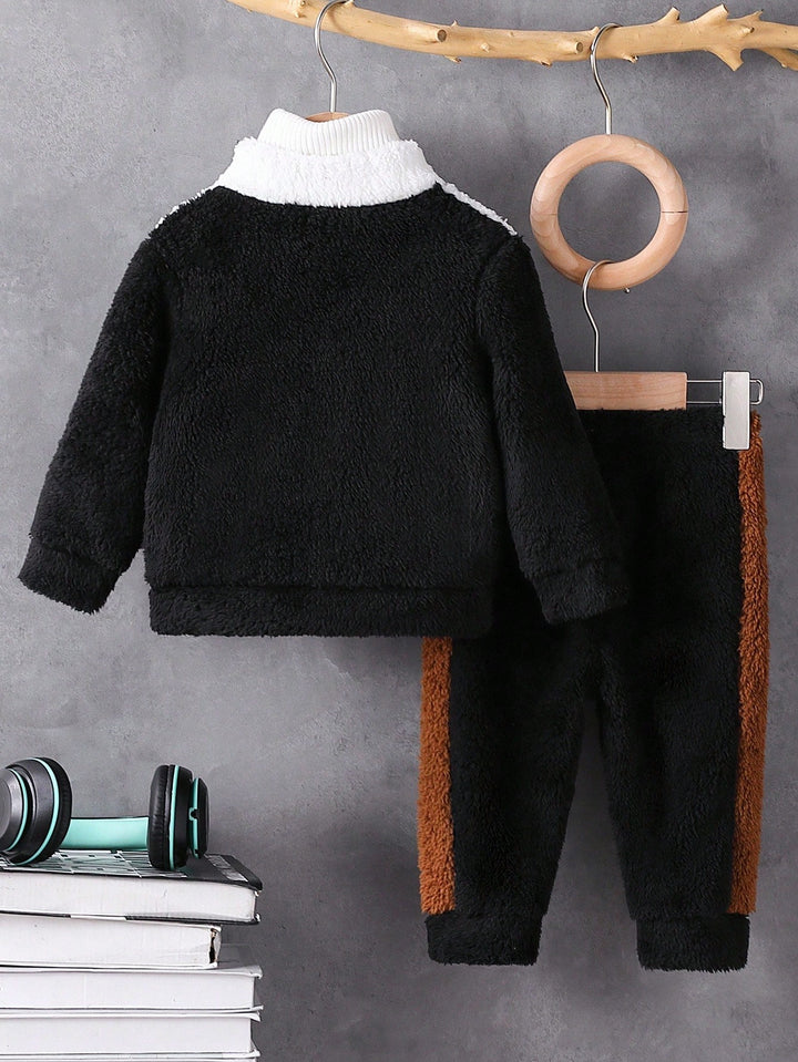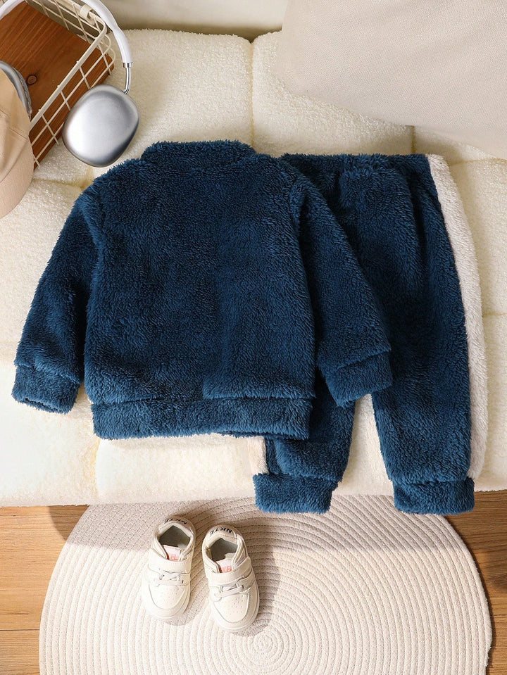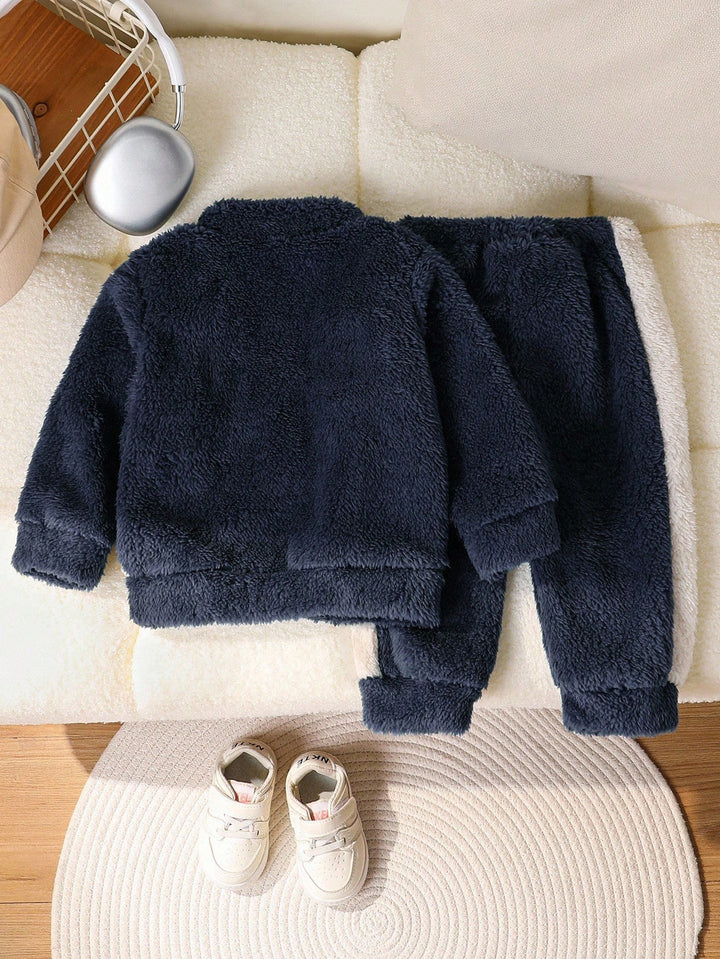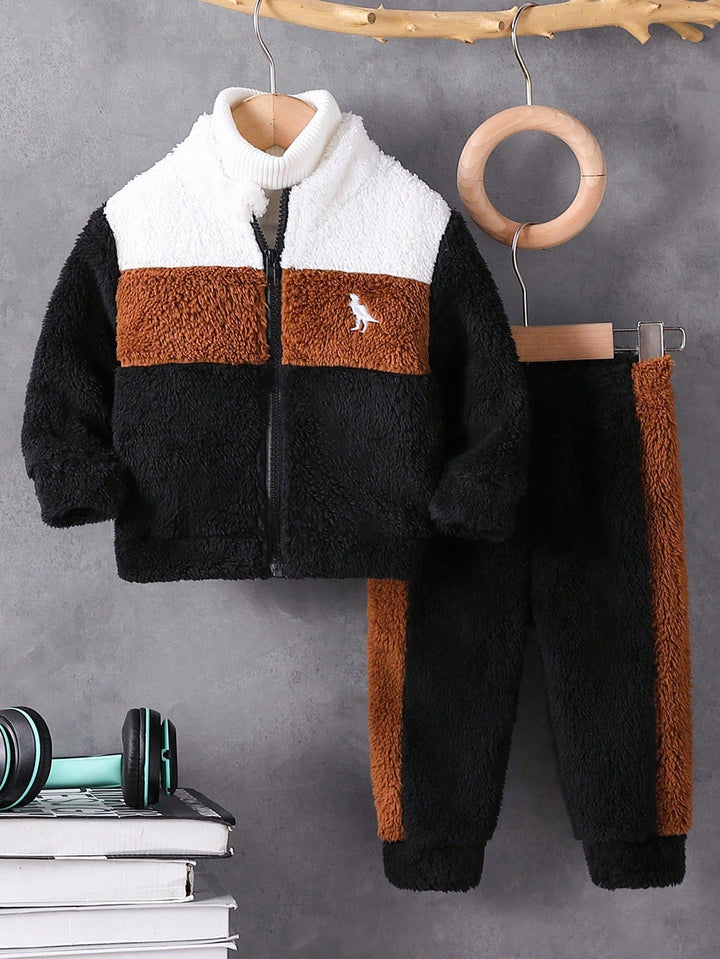 Baby Boys' Plush Warm Dinosaur Pattern Matching Casual Thick Jacket And Pants Set