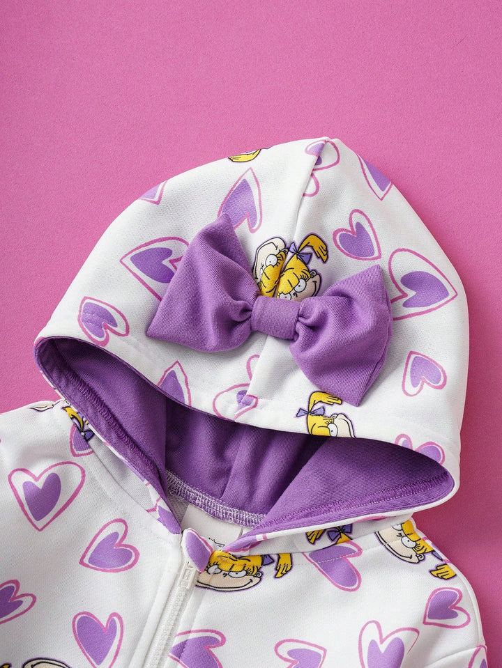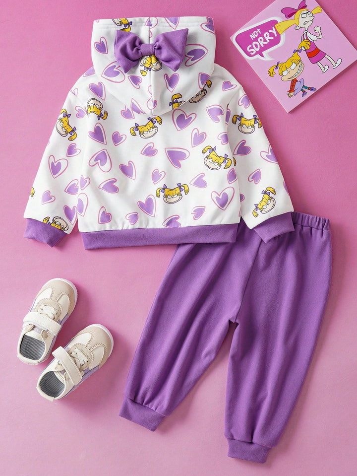 Baby Girl Cute Heart Print Hooded Sweatshirt And Purple Pants Set