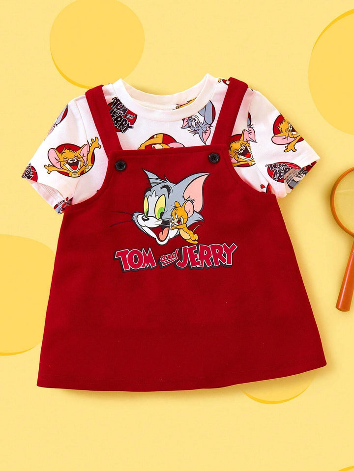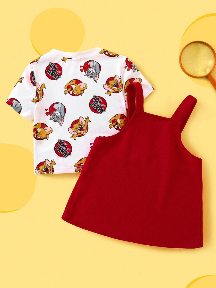 Baby Girl Dot Print Cartoon T-Shirt And Red Suspender Pinafore Dress