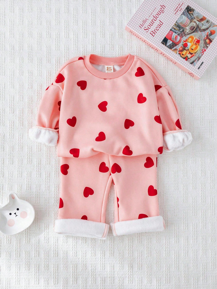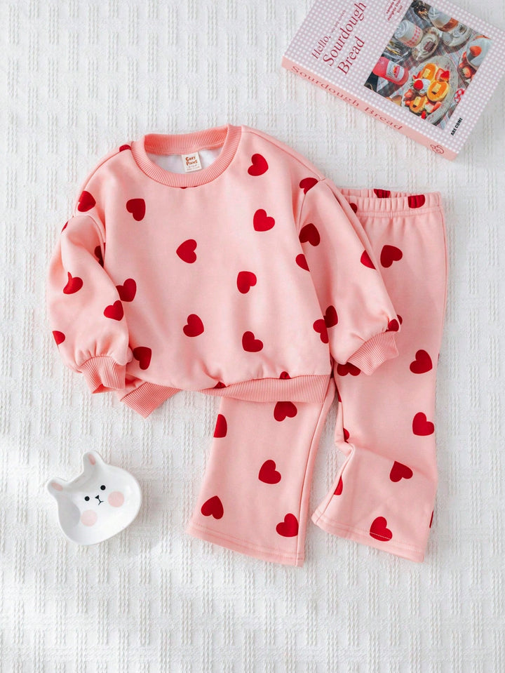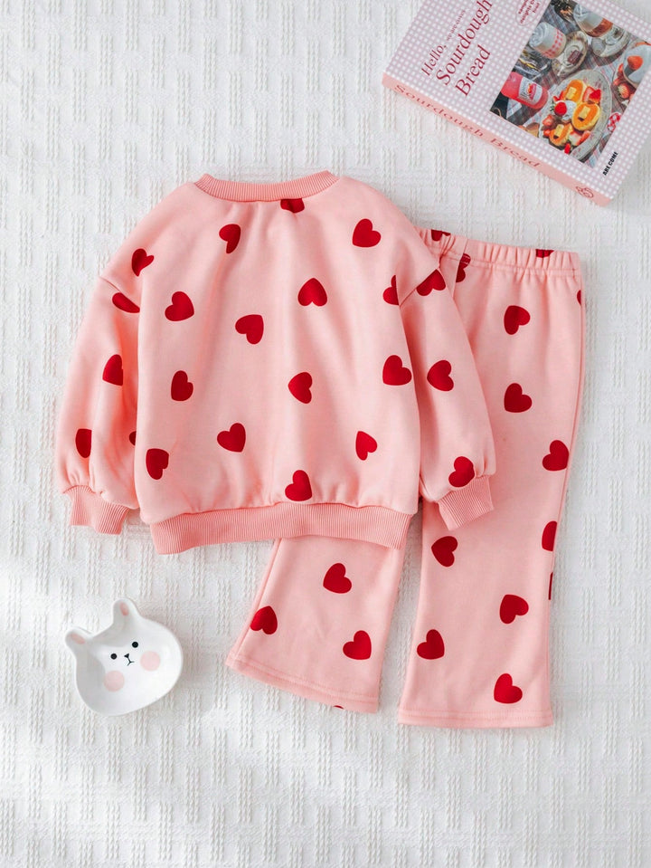 Baby Girl Heart Pattern Knitted Soft Crew Neck Long Sleeve Sweatshirt And Elastic Waist Flared Pants