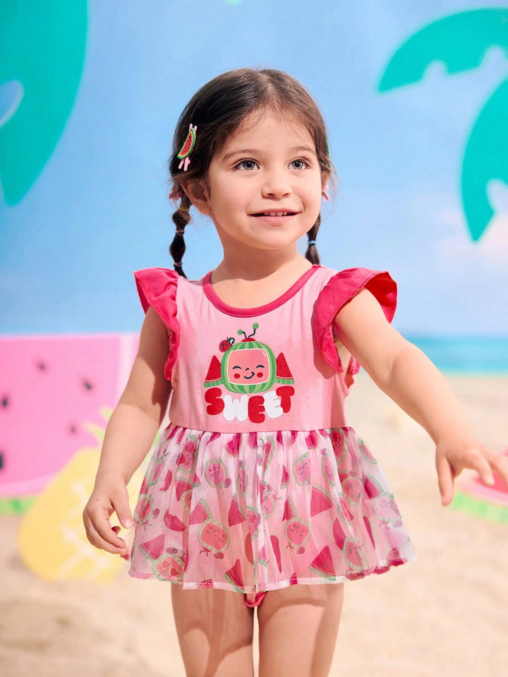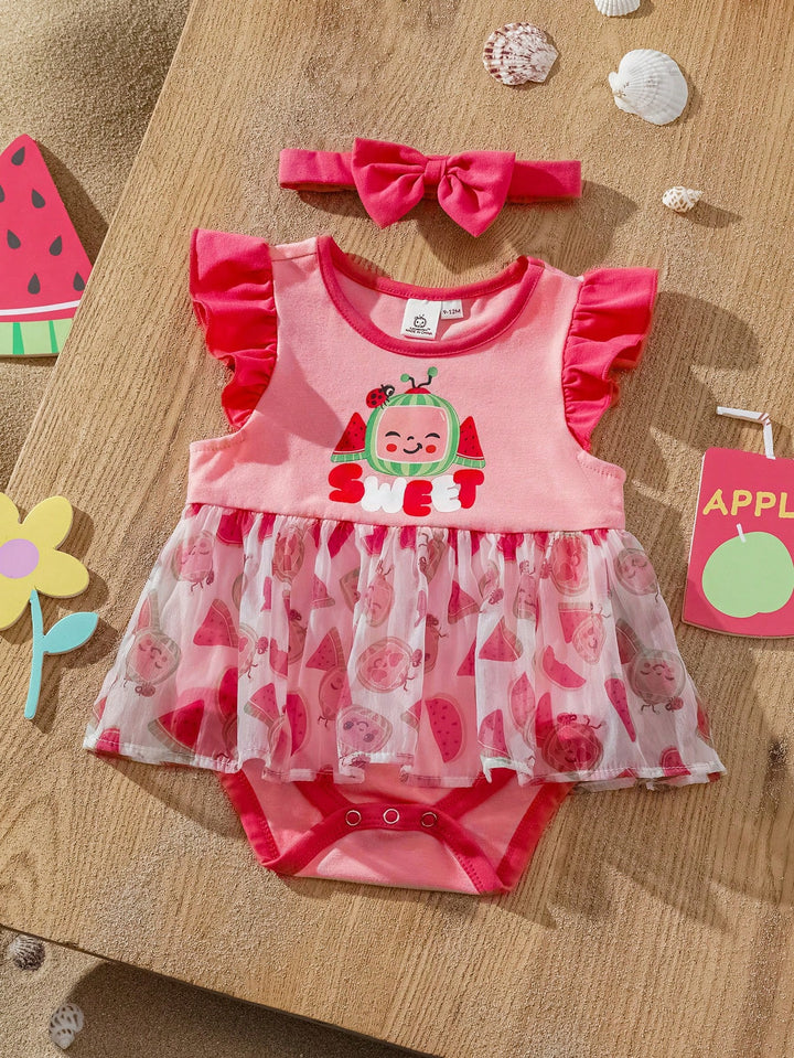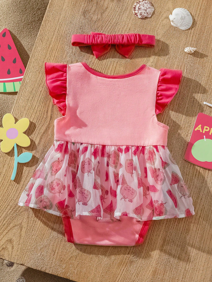 Baby Girl Knit Watermelon Pattern Colorblock Round Neck Cap Sleeve Contrast Mesh Romper With Headband