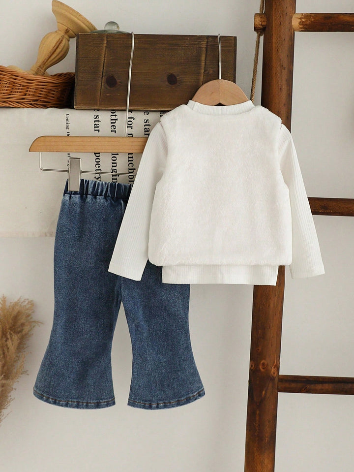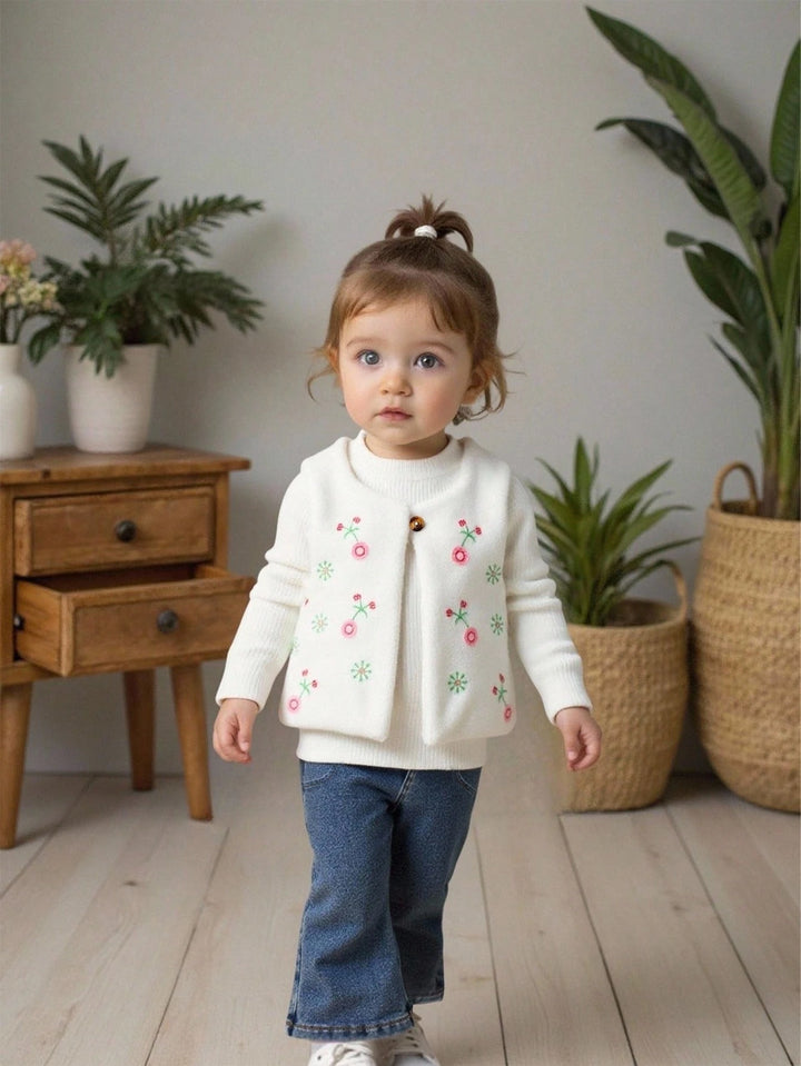 Casual Style Suit Flower-Embroidery Vest&Pure Color Long Sleeve Top&Long Jeans