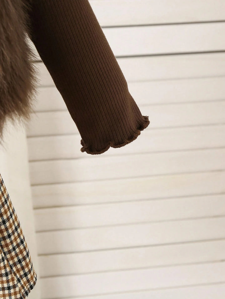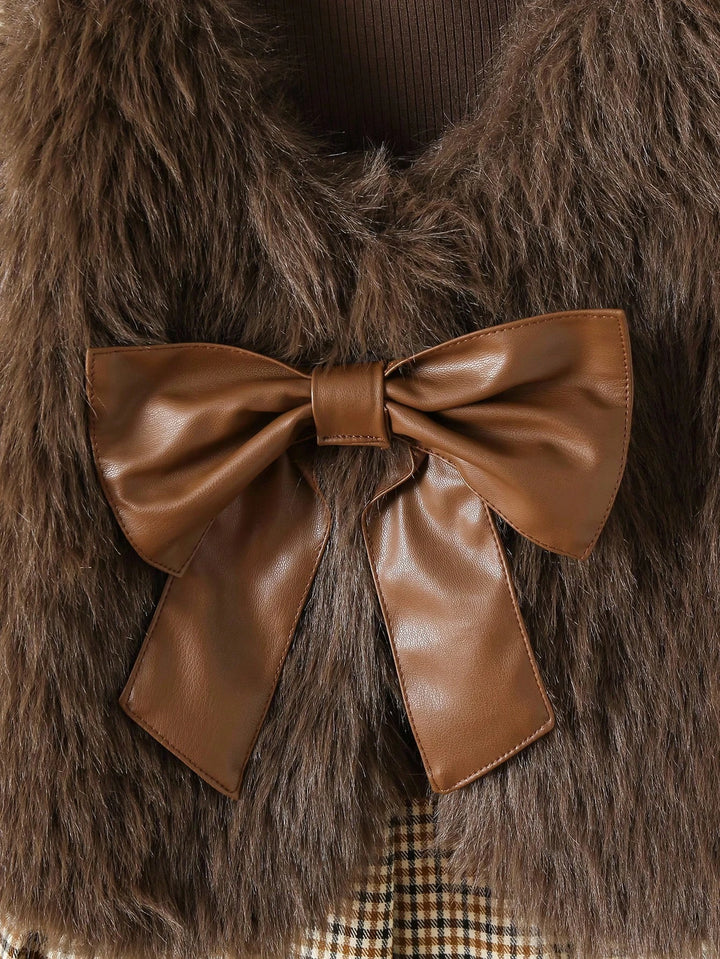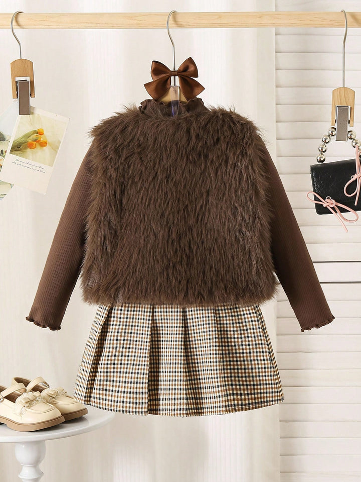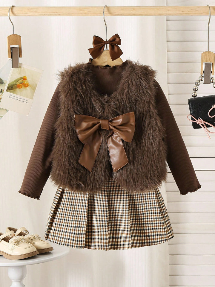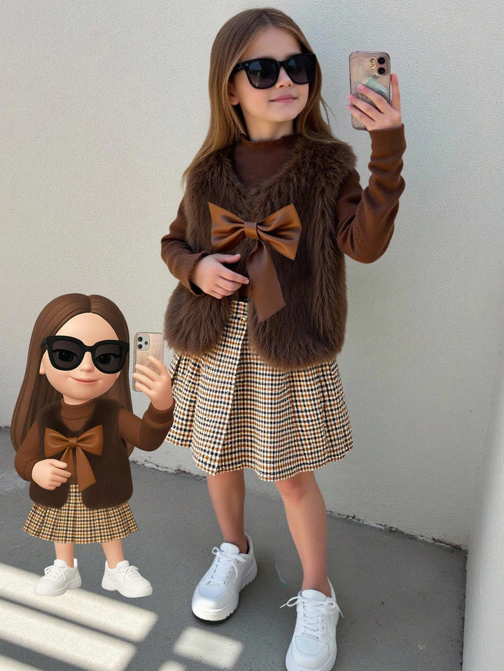 Elegant Faux Fur Bow Vest, Round Neck T-Shirt, Plaid Skirt Set Girls Brown Fur Vest