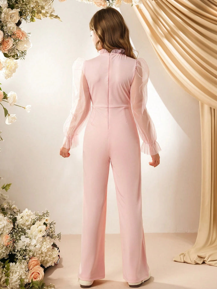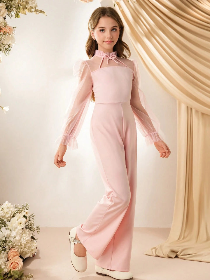Fashion Round Neck Long Sleeve High Waist Solid Color Mesh Hollow Bowknot Maxi Romper