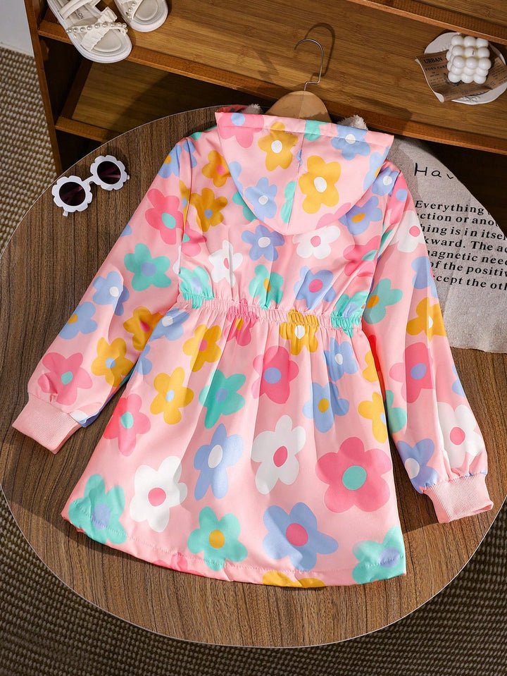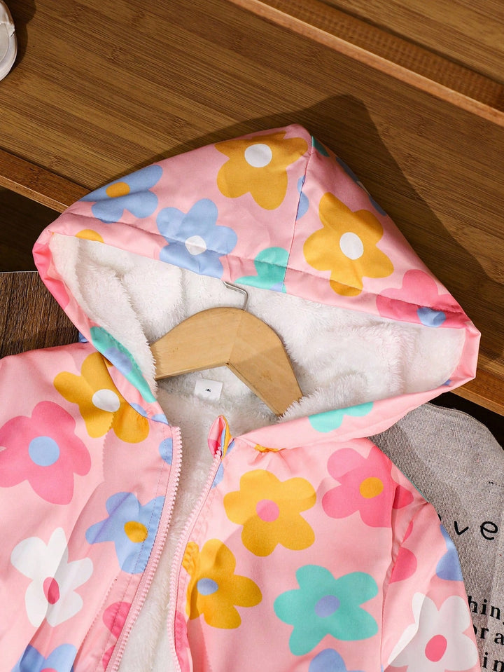 Flower Hooded Zip-Up Elastic Waist Ribbed Cuff Long Sleeve Fleece Lined Mid-Length Comfortable Jacket