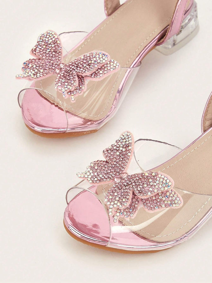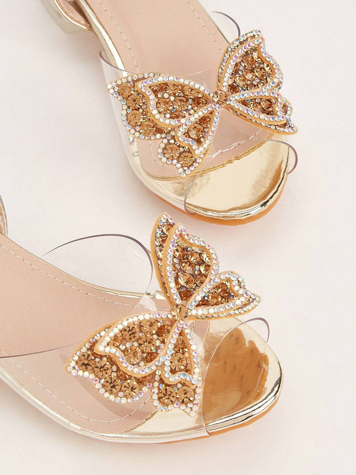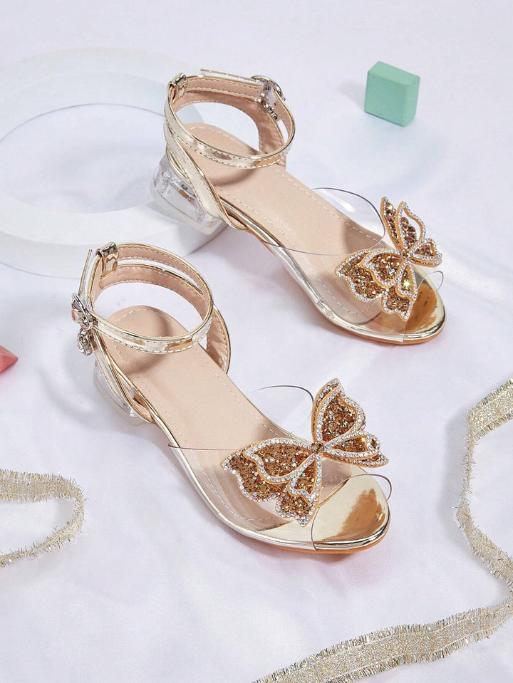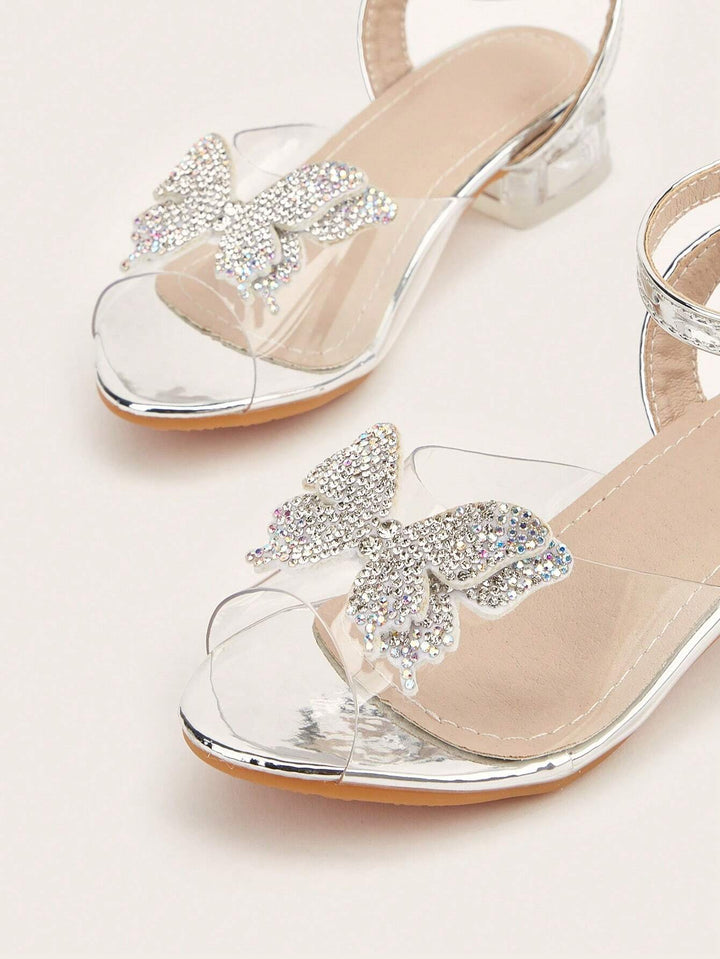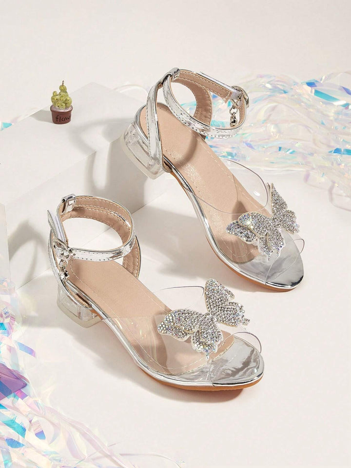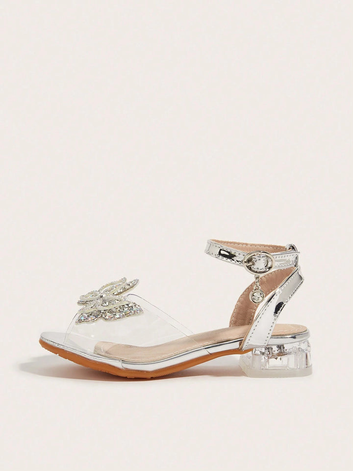 Girls' Chunky Heel Silver Glitter Butterfly Crystal Sandals