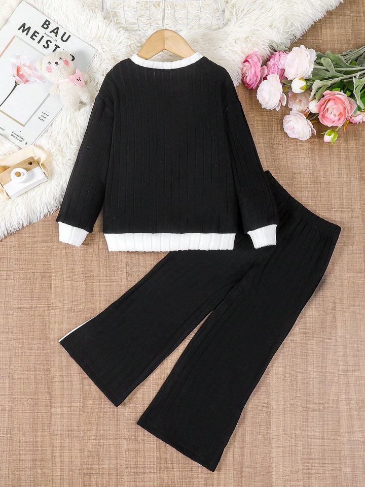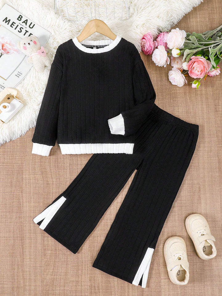Girls Ribbed Brushed Patchwork Long Sleeve Top And Pants