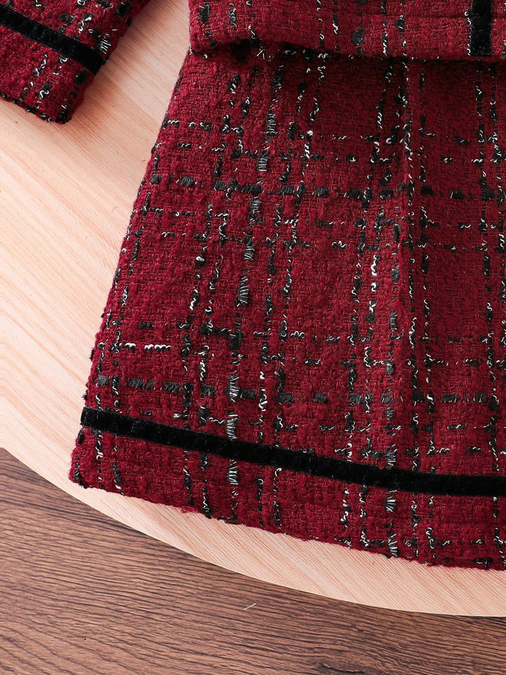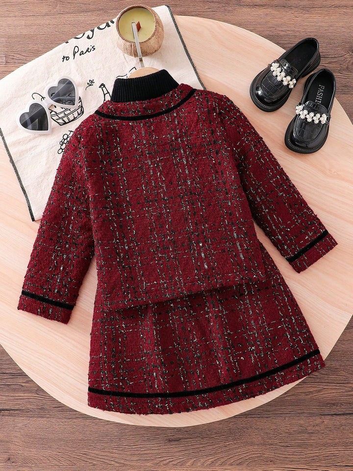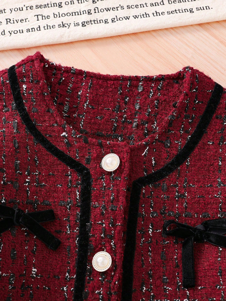 Girls' Round Neck Long Sleeve Purple & Plaid Bow Decor T-Shirt + Purple & Plaid Skirt