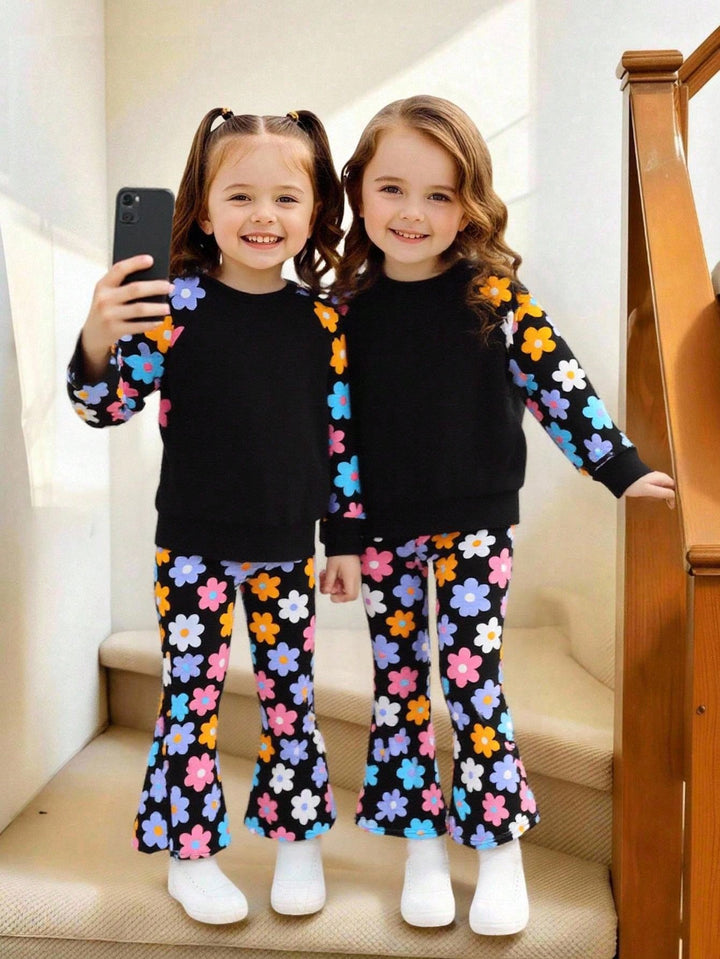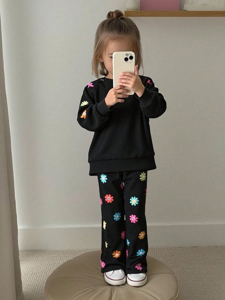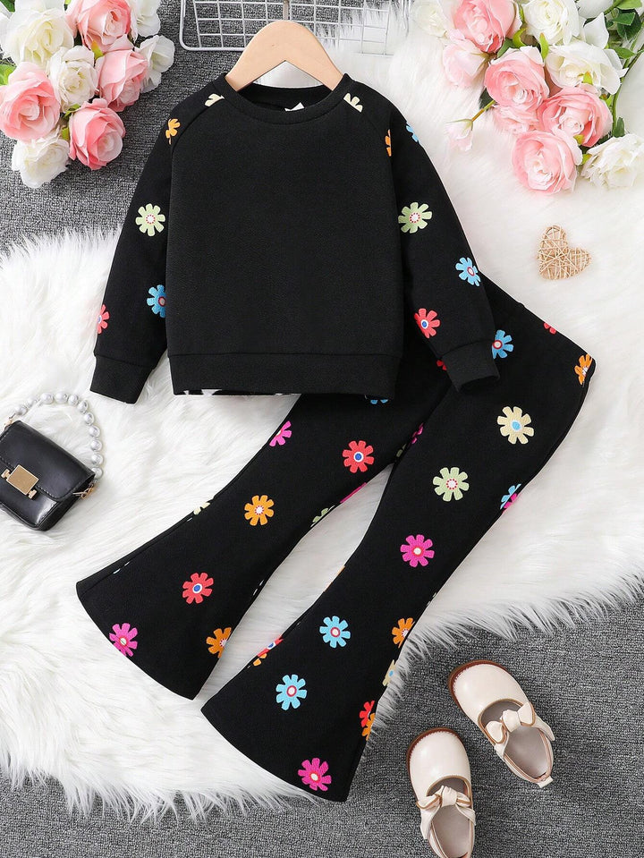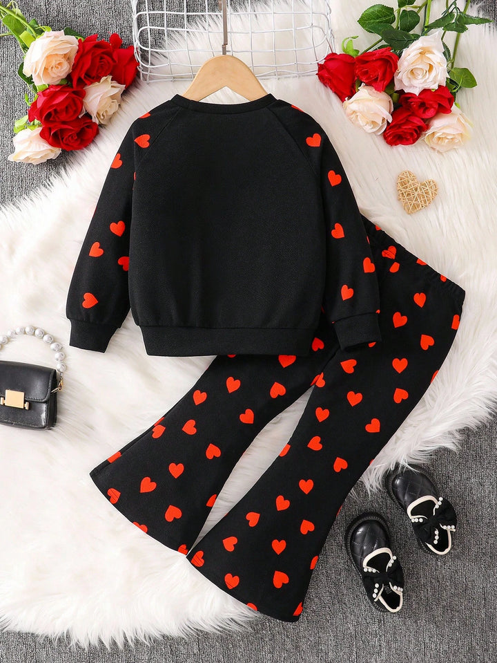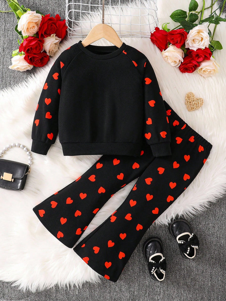 Heart Print Patchwork Raglan Sleeve Pullover Sweatshirt And Flare Pants