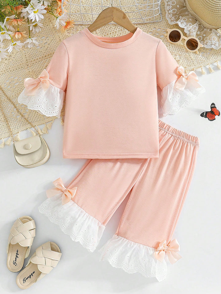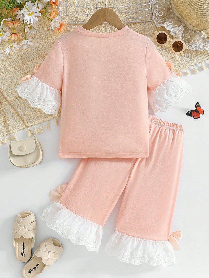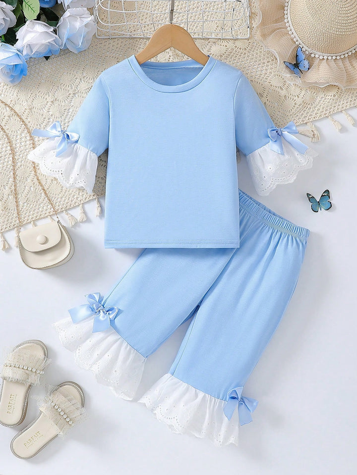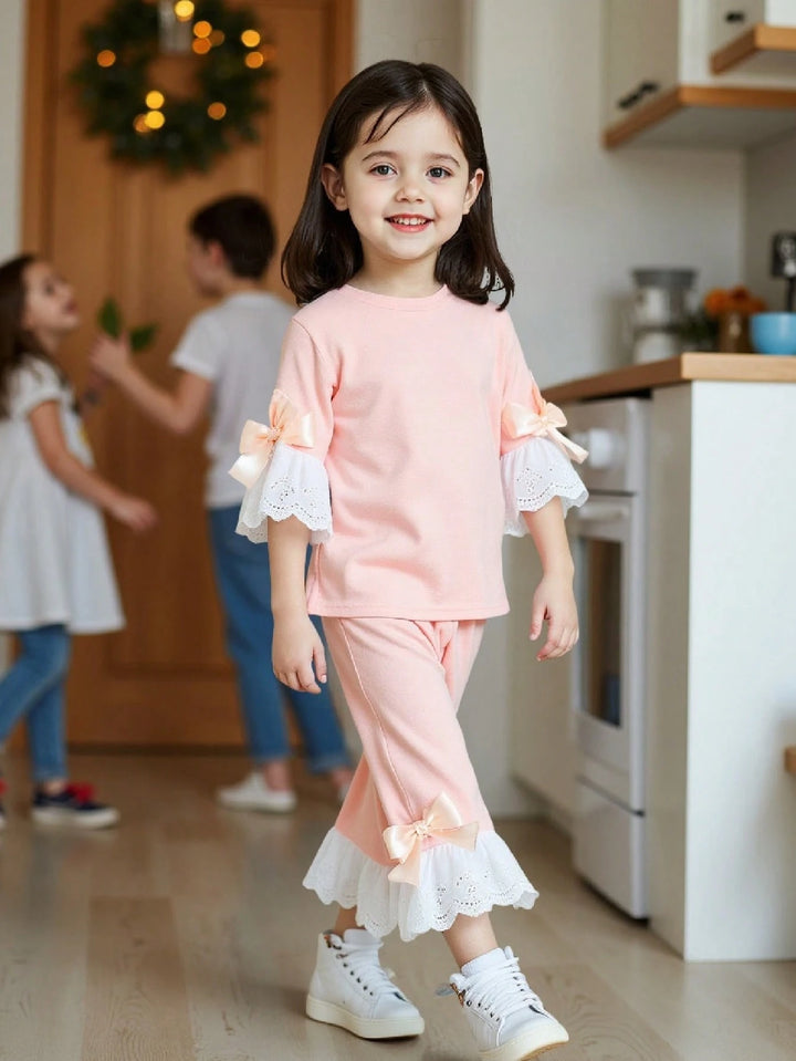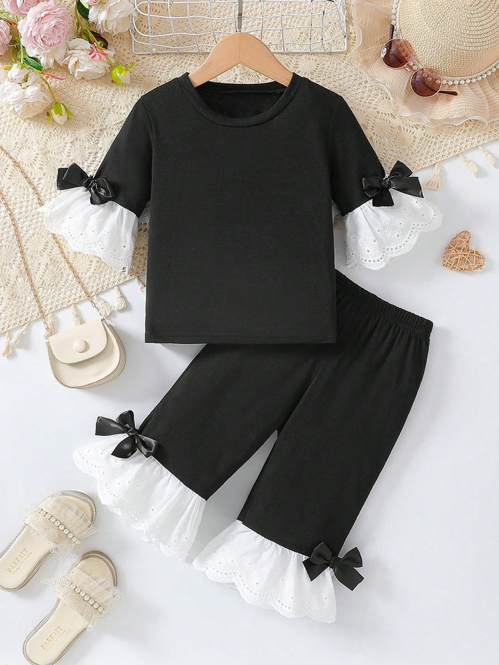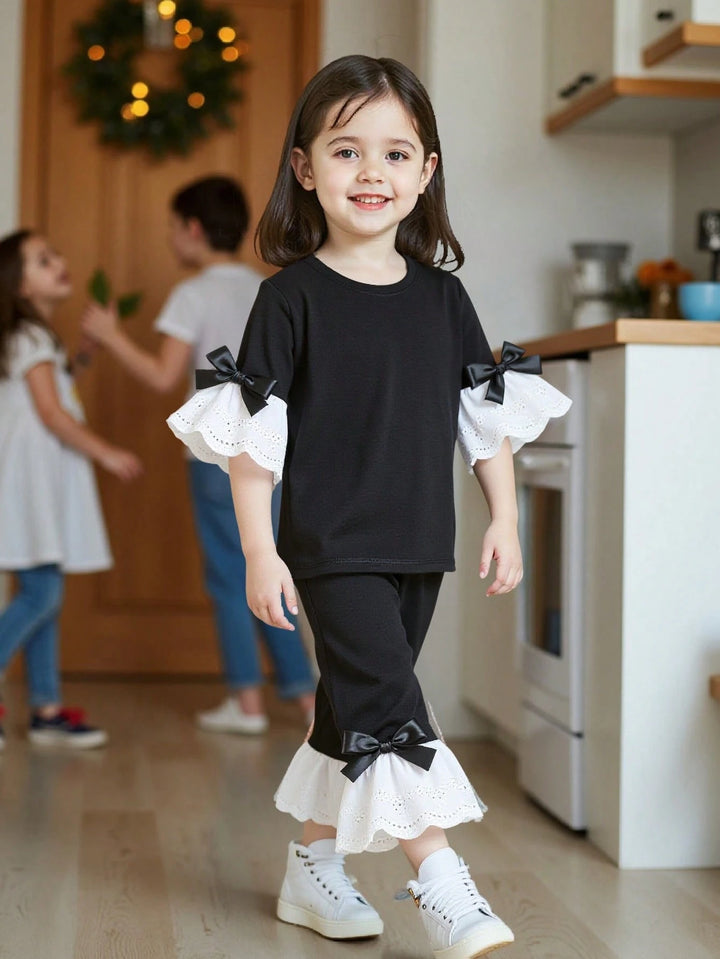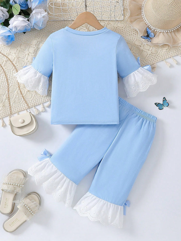 Includes Round Neck Butterfly Decor Flare Sleeve Blouse And Flare Hem Pants