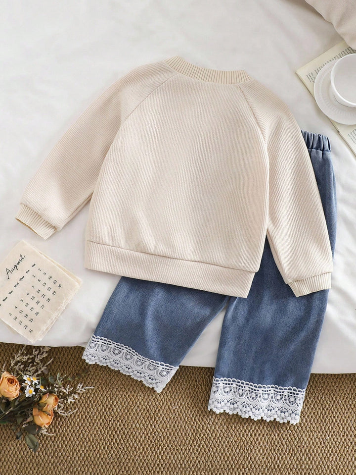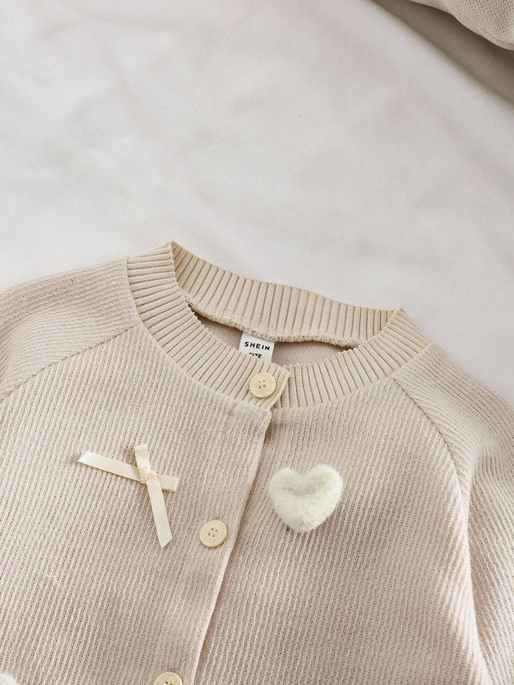 Jacquard Knit Heart & Bow Decor Long Sleeve Cardigan Jacket Paired With Patchwork Lace Trim Denim Pants Set