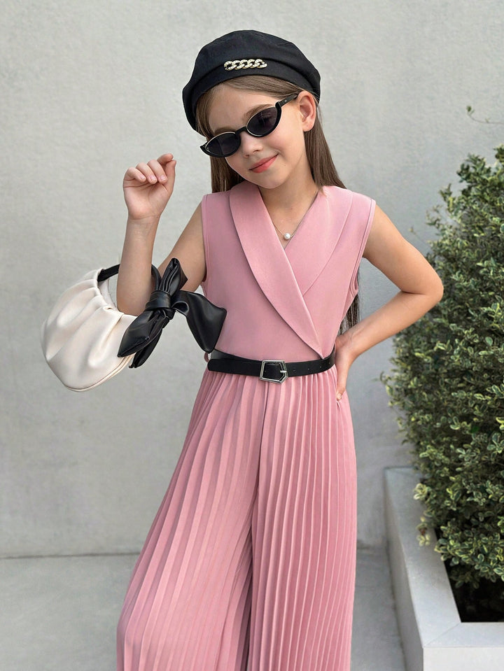 Nova Glow Tween Girls Solid Lapel Collar Sleeveless Jumpsuits With Pleated Design