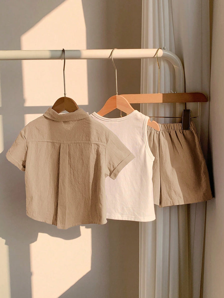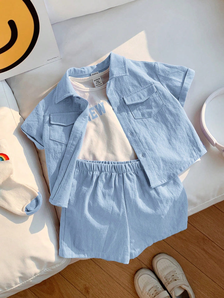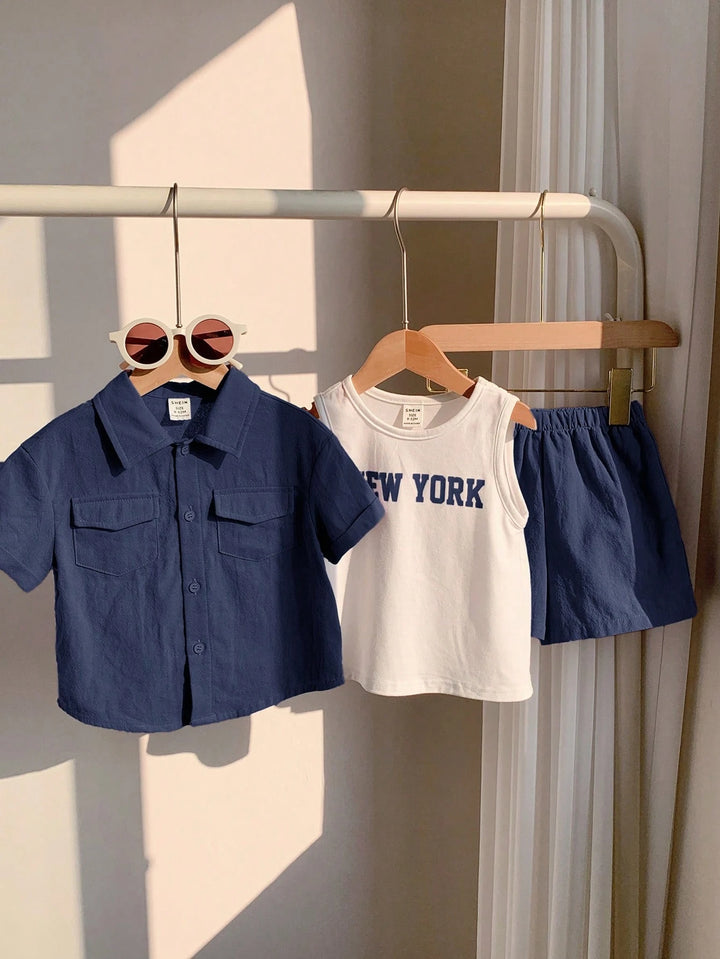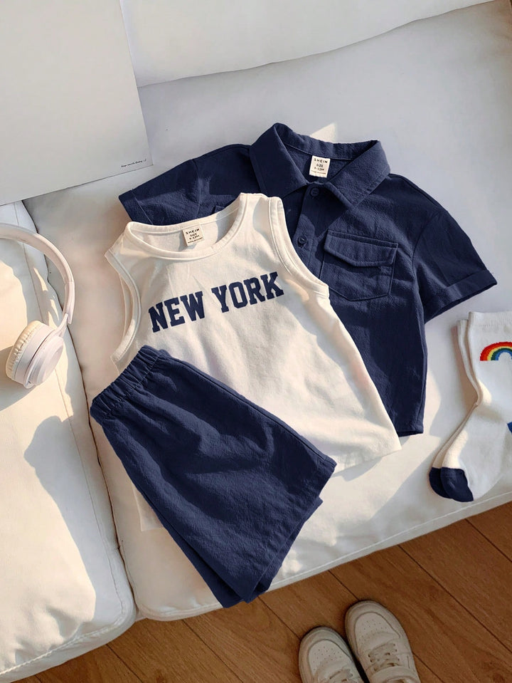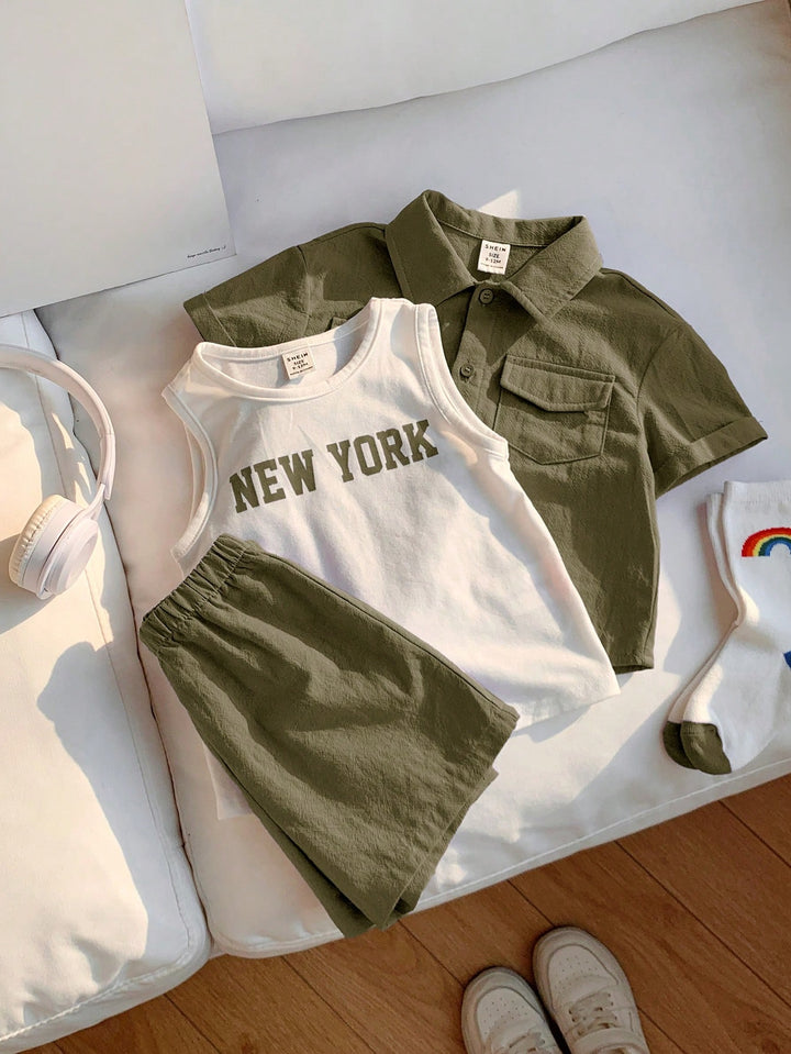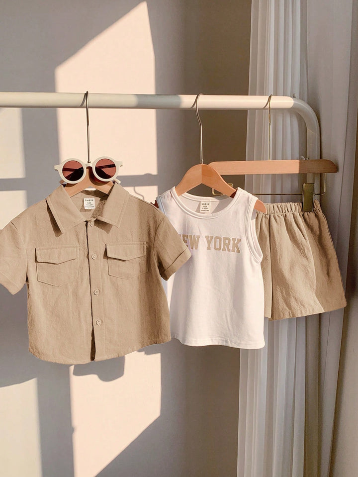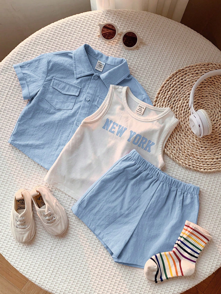 Summer Collared Short Sleeve Cardigan, Elastic Waist Shorts, Letter Printed Sleeveless Vest