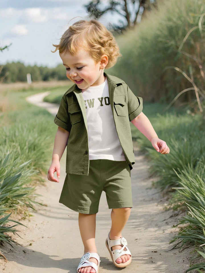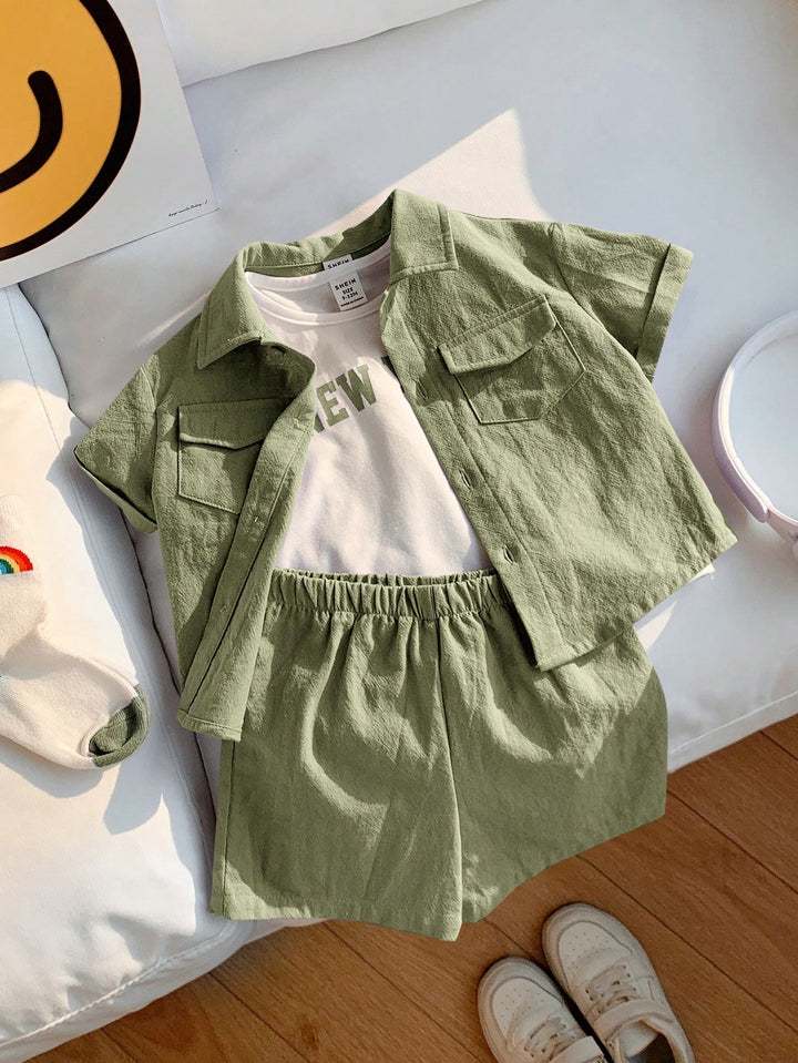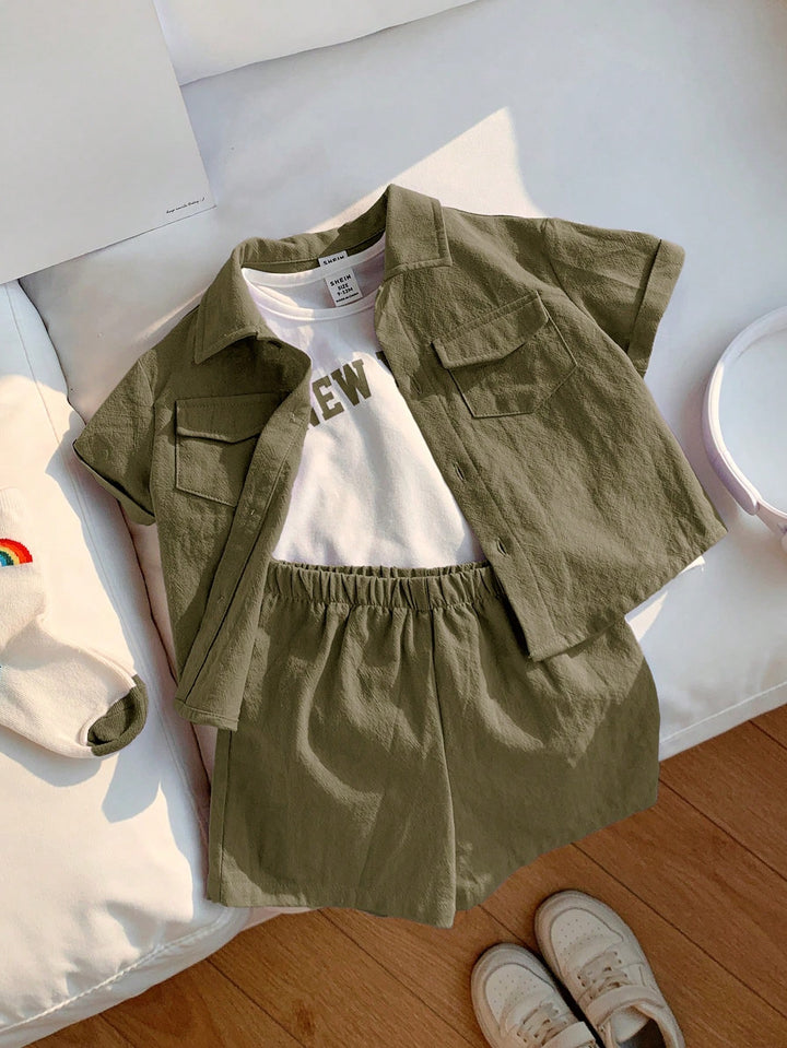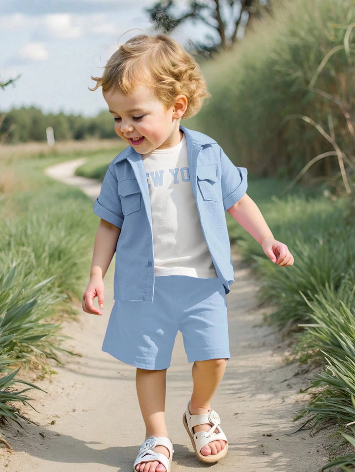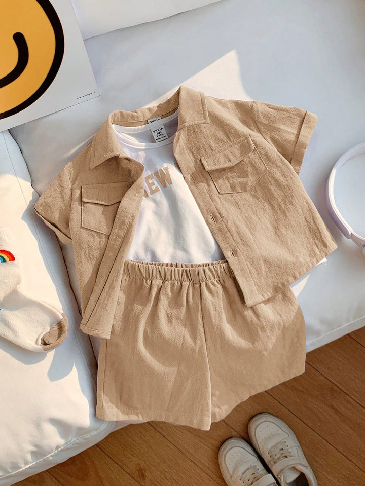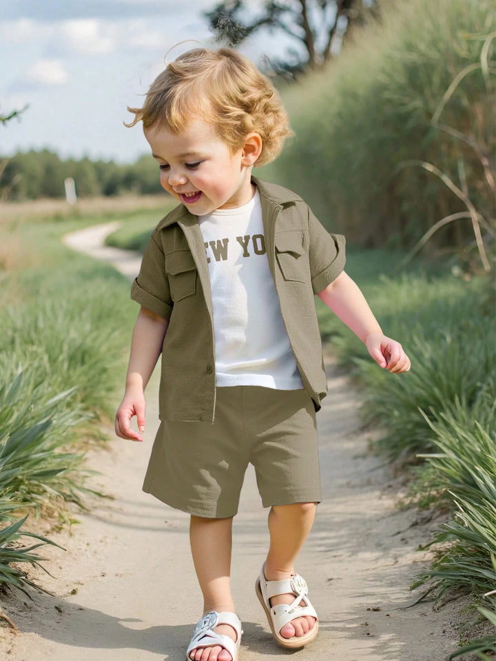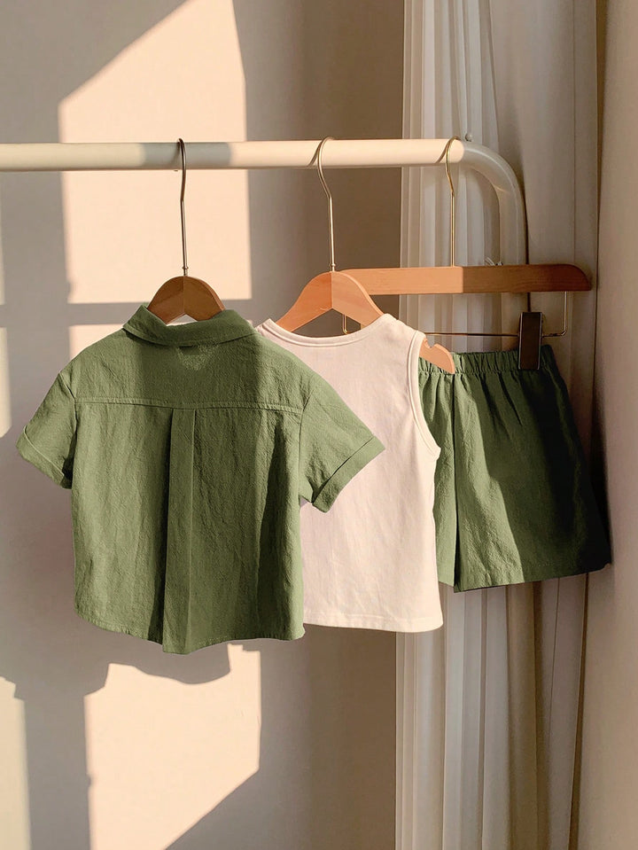 Summer Collared Short Sleeve Cardigan, Elastic Waist Shorts, Letter Printed Sleeveless Vest