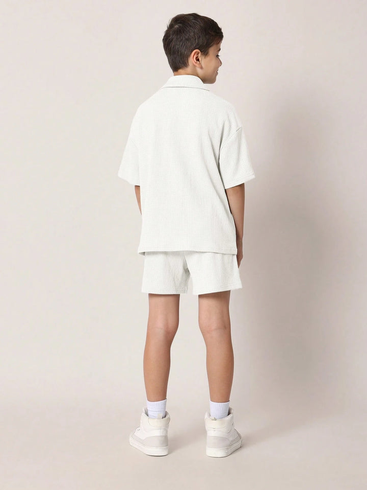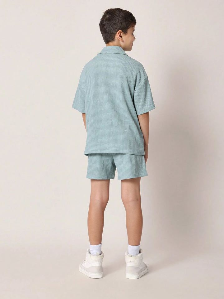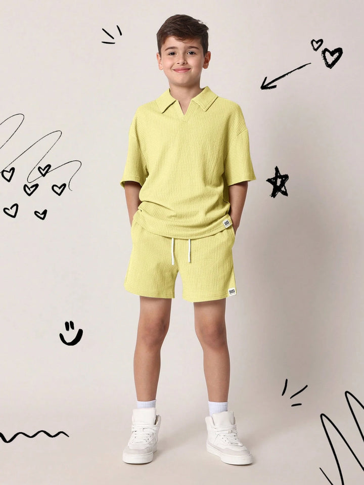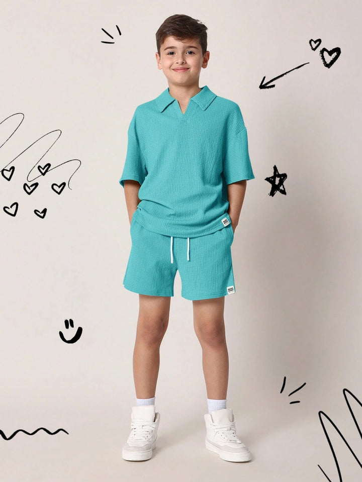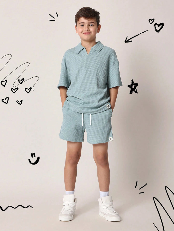 SUMWON Textured Ribbed Knit Polo Two-Piece Short Set