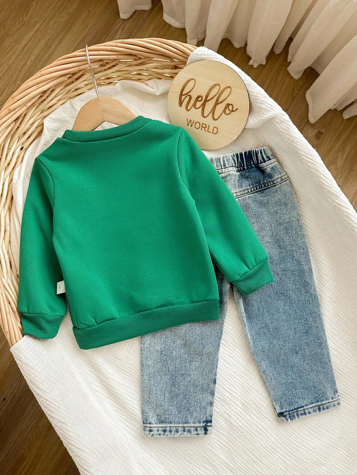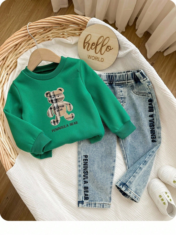Toddler Boy Olive Green Fleece Lined Sweatshirt With Denim Pants