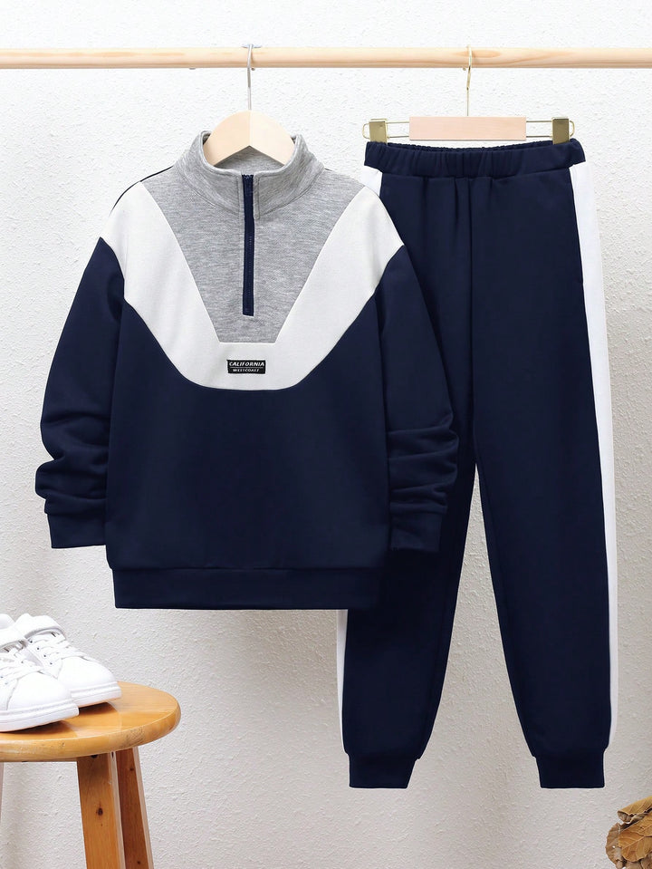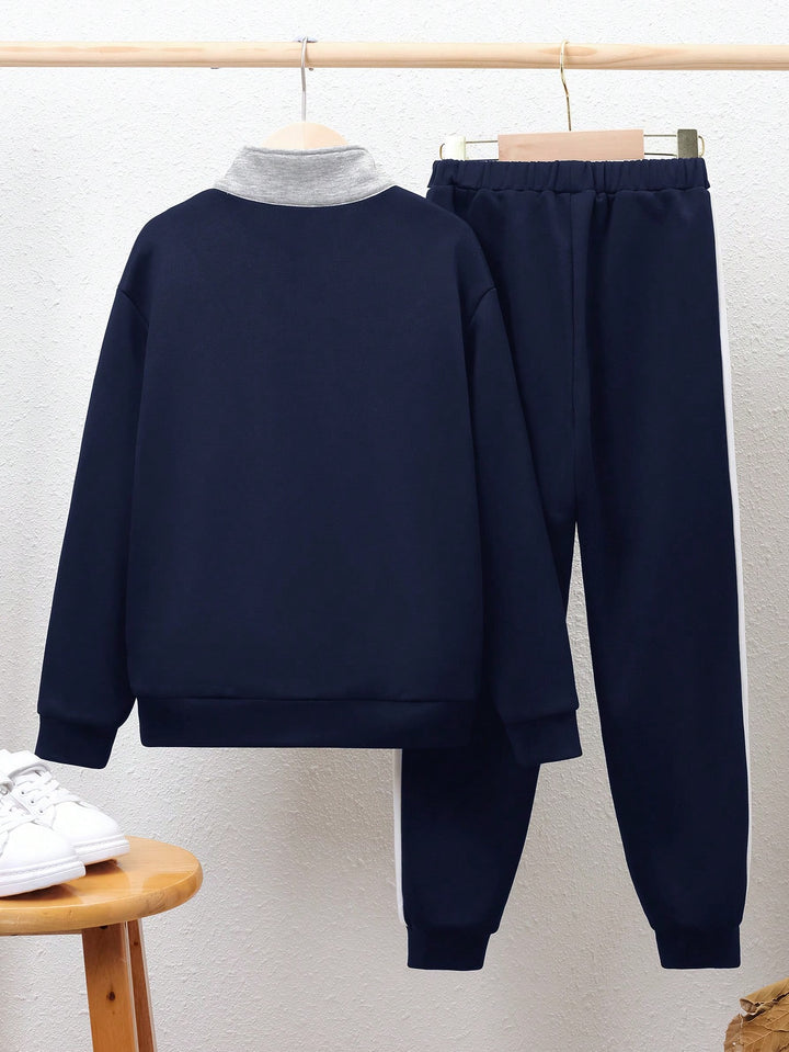 Tween Boy Spliced Color Block Stand Collar Sweatshirt And Pants Set
