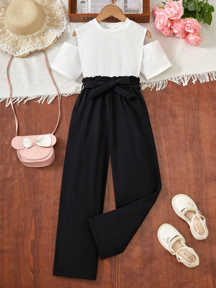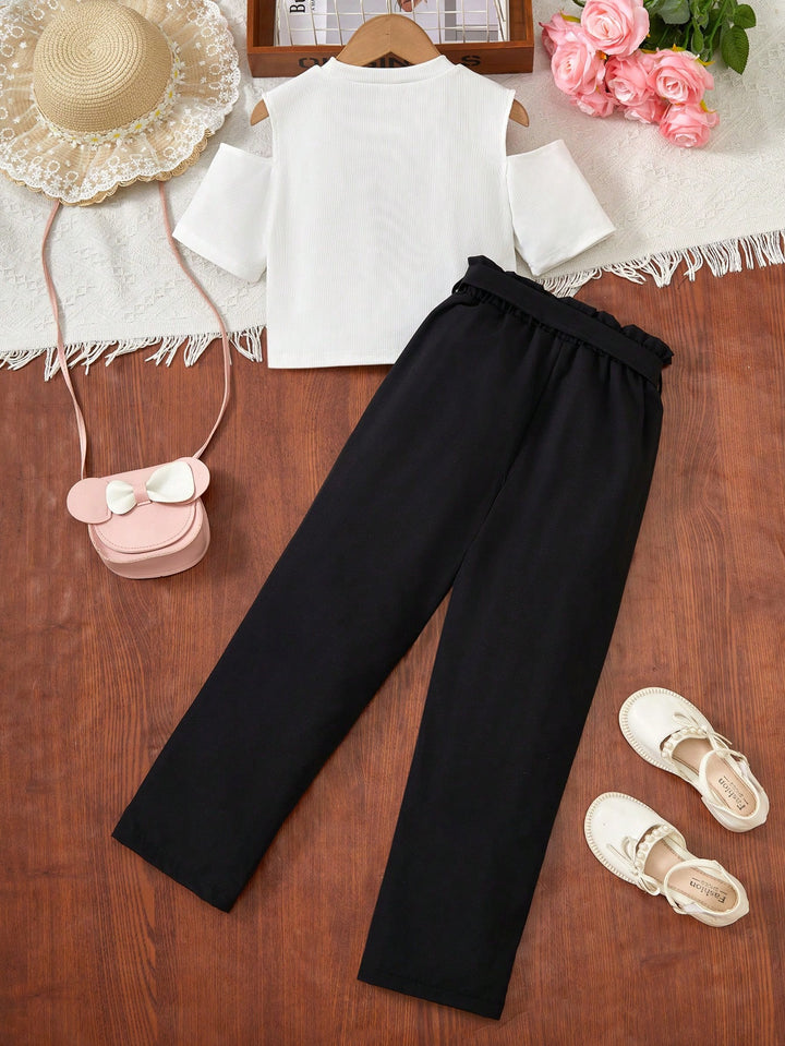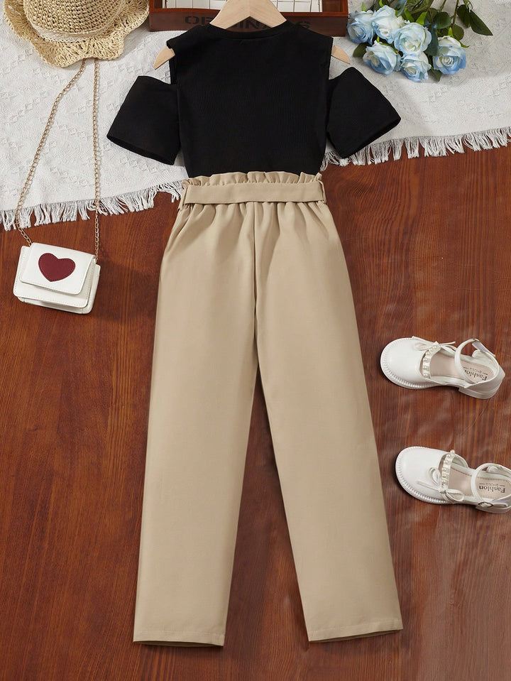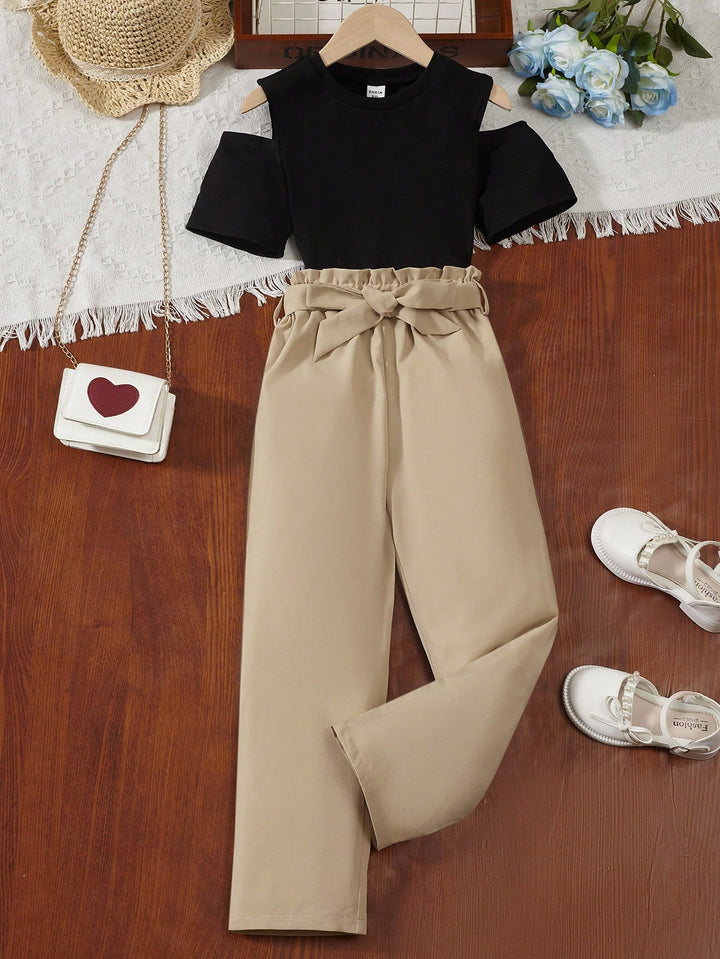 Tween Girl Cold Shoulder Tee & Paperbag Waist Belted Pants