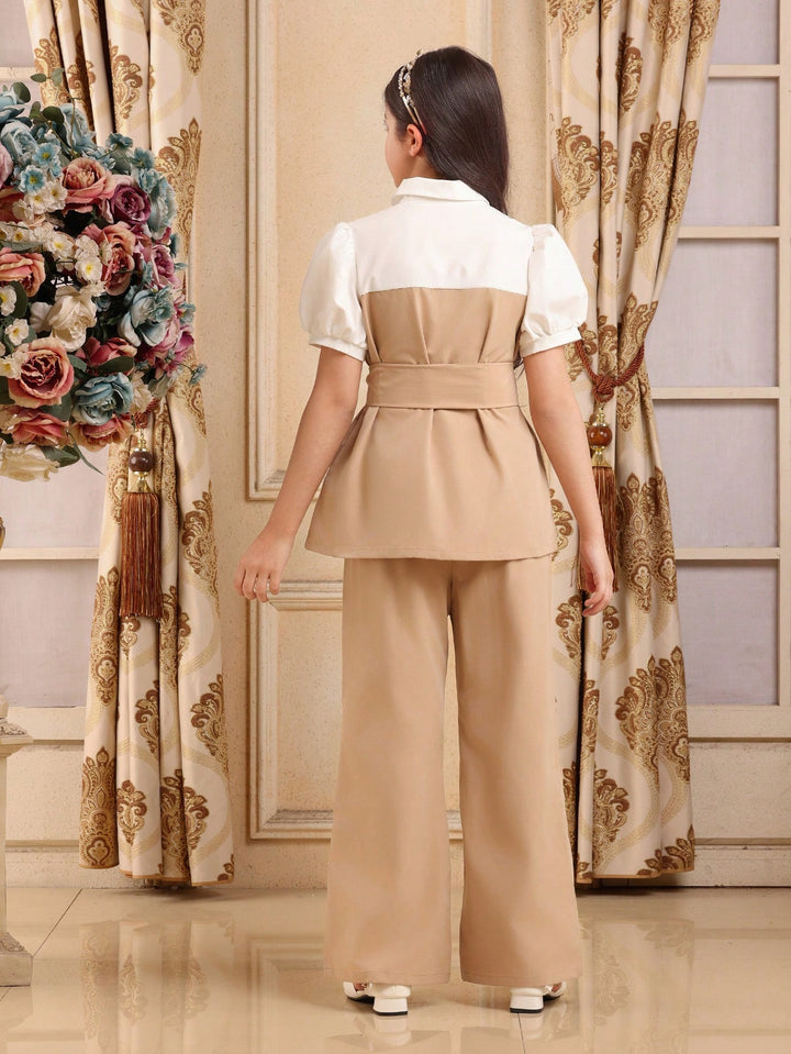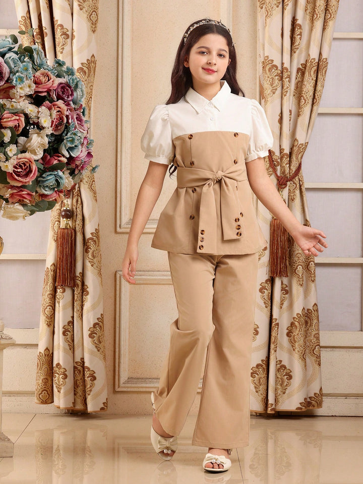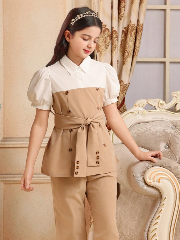 Tween Girl Elegant Color Block Puff Sleeve Shirt And Long Pants