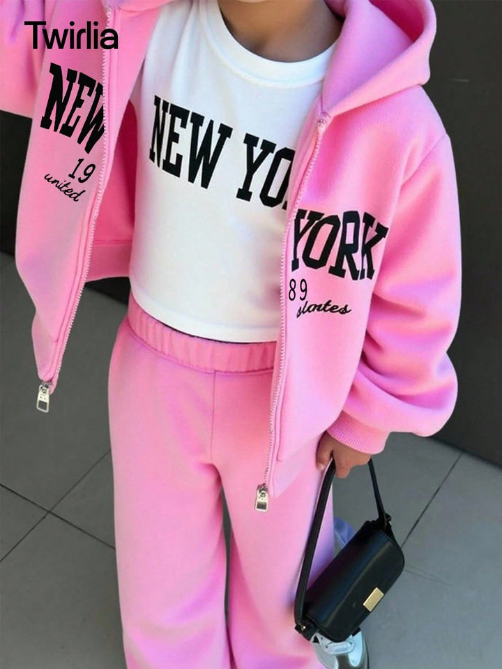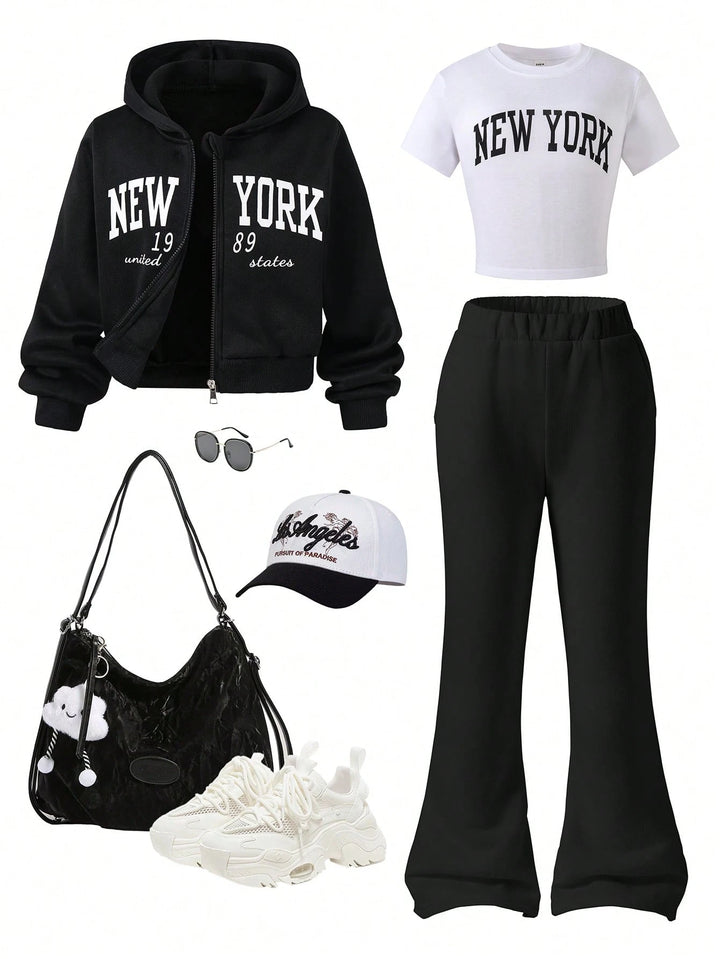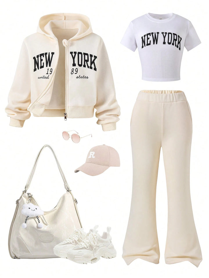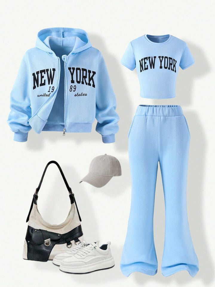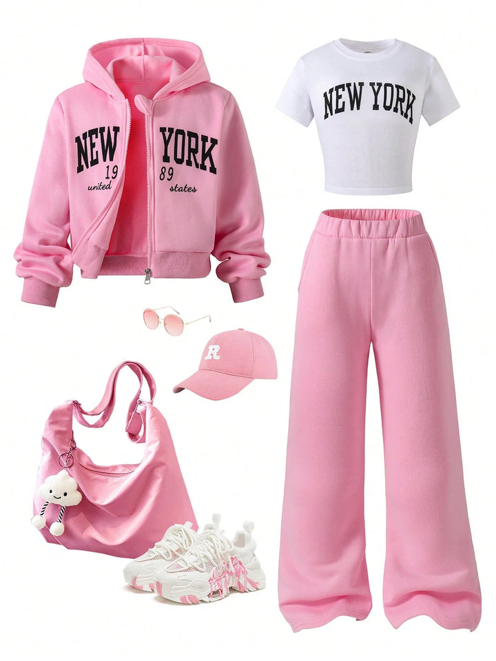 Tween Girl Fleece Hooded Zip-Up Jacket With Location Print, Location Print Short Sleeve Tee & Fleece Flared Pant
