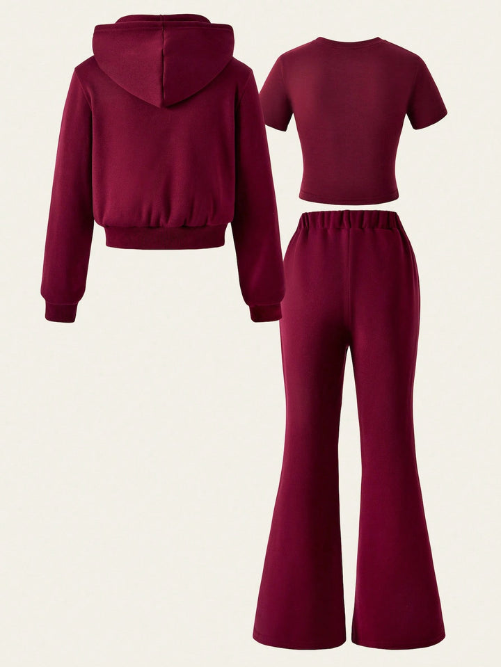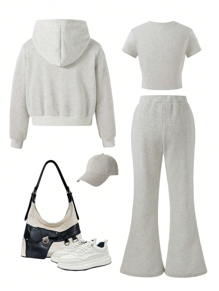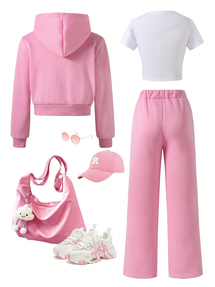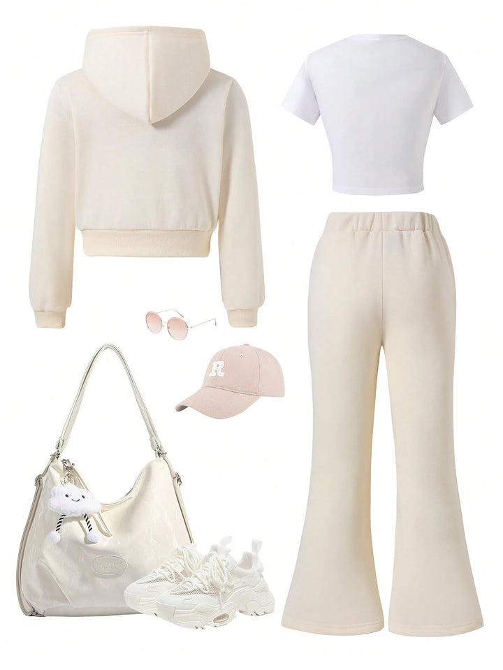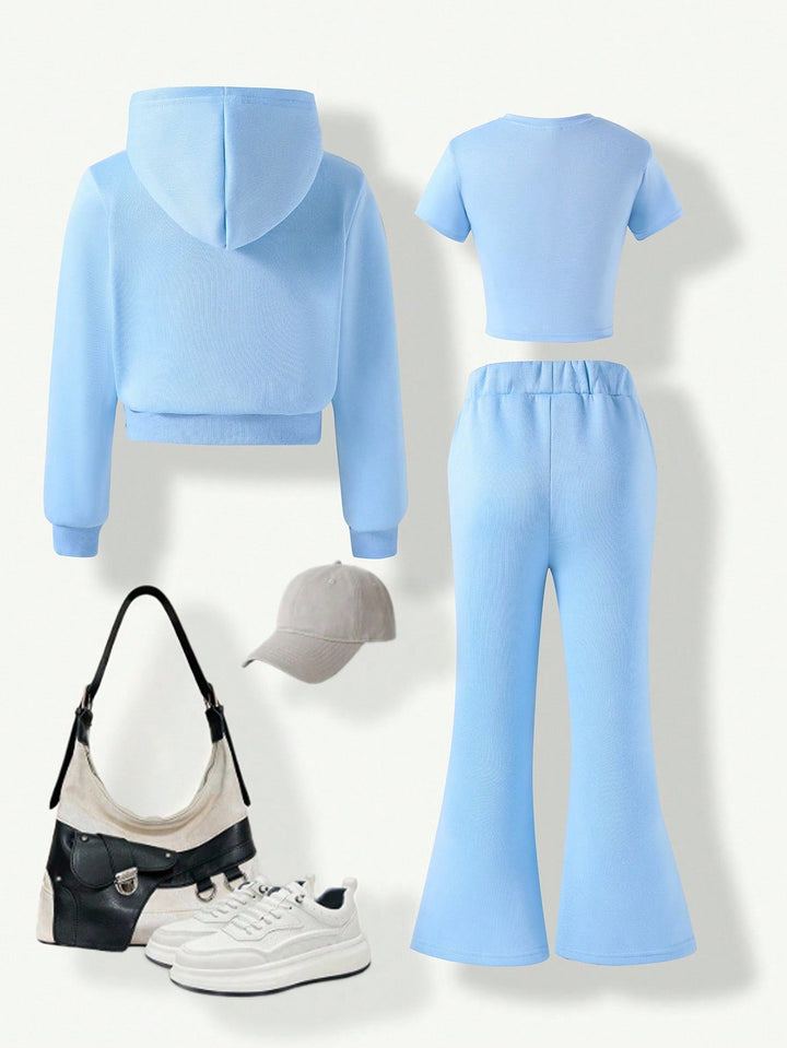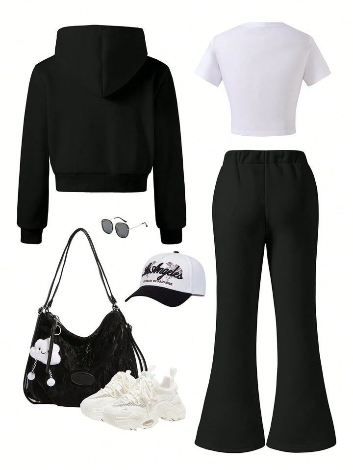 Tween Girl Fleece Hooded Zip-Up Jacket With Location Print, Location Print Short Sleeve Tee & Fleece Flared Pant