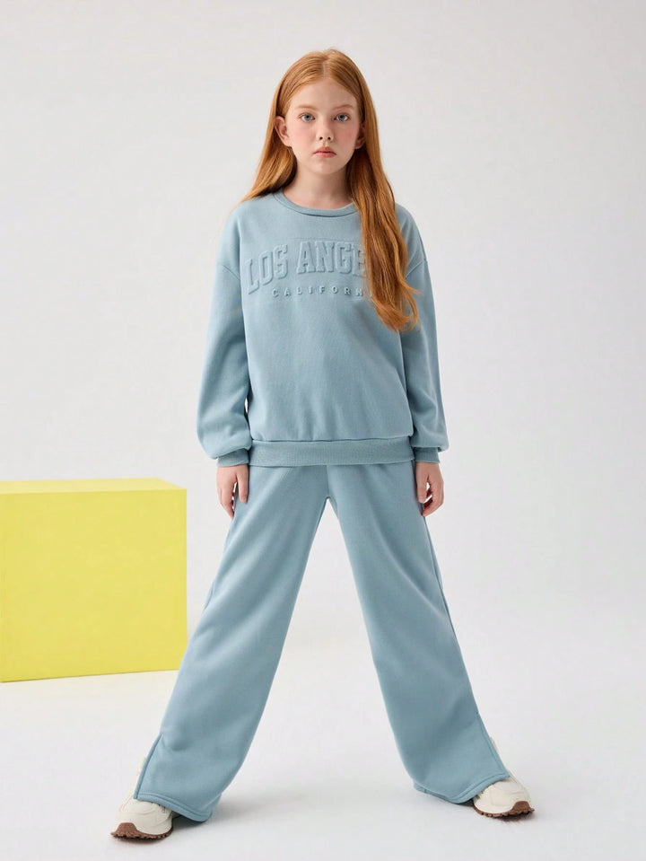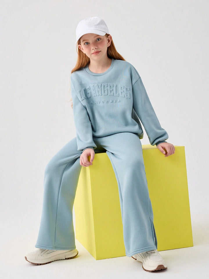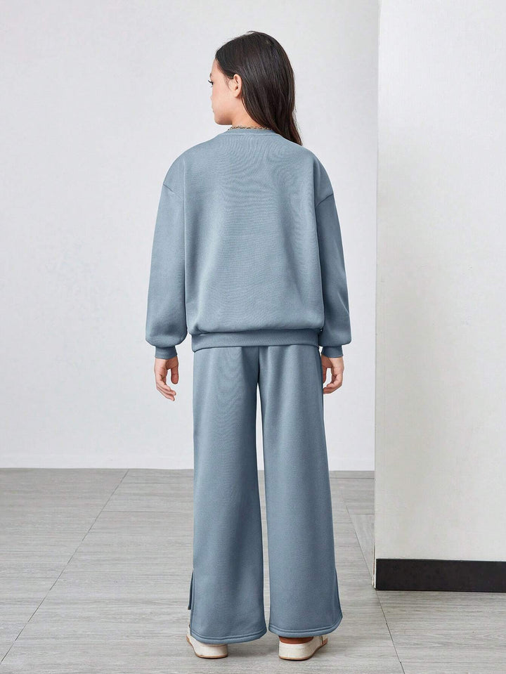 Tween Girl Loose Flocked Crew Neck Long Sleeve Hoodie & Split Side Long Sweatpants