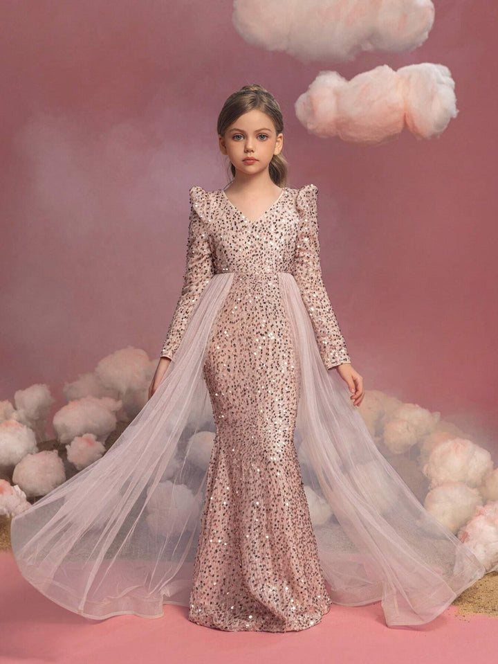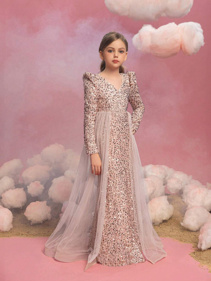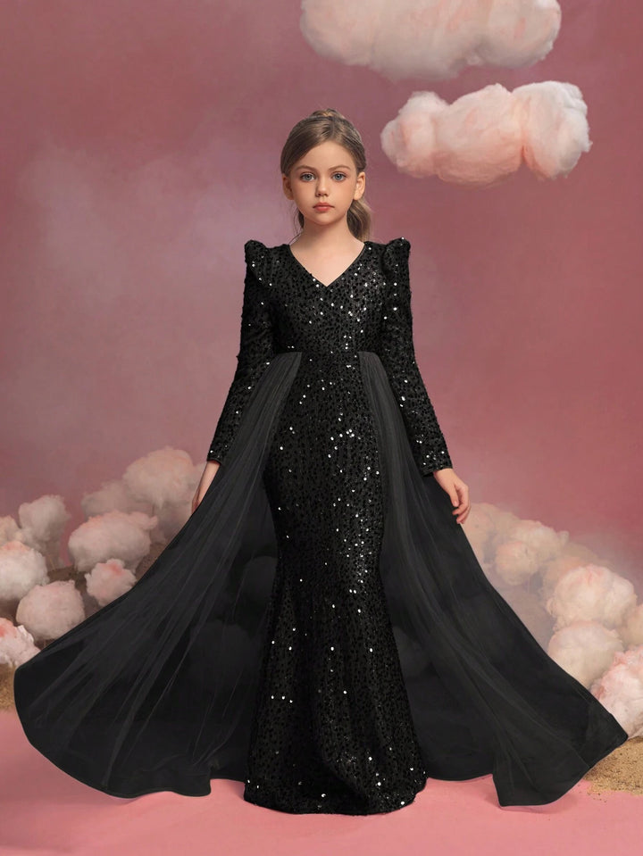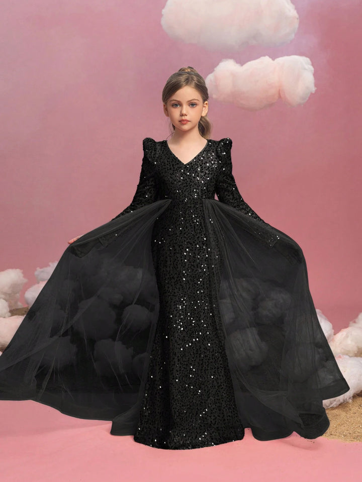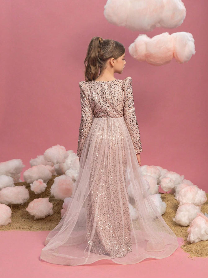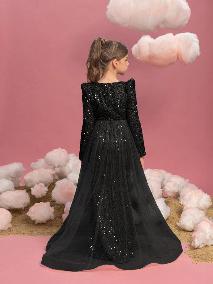 Tween Girls Long Sleeve Sequin Contrast Mesh Maxi Party Dress