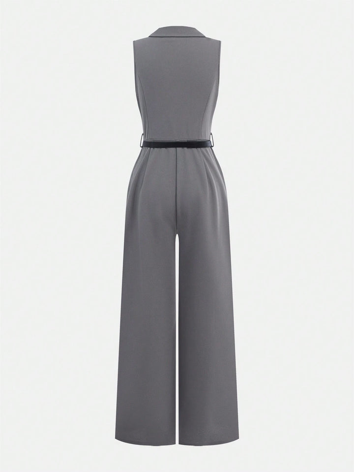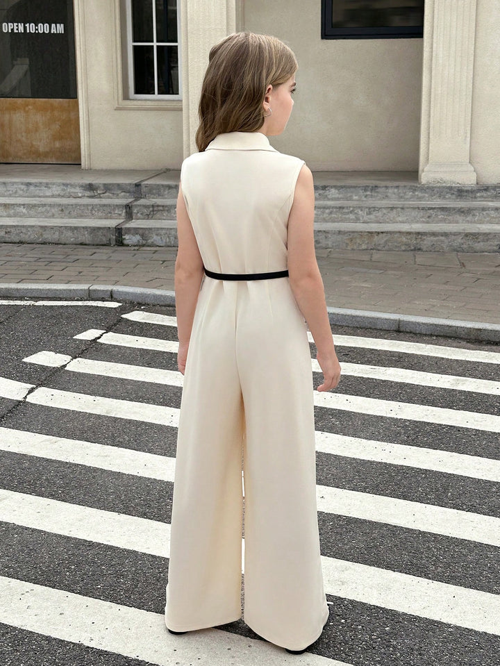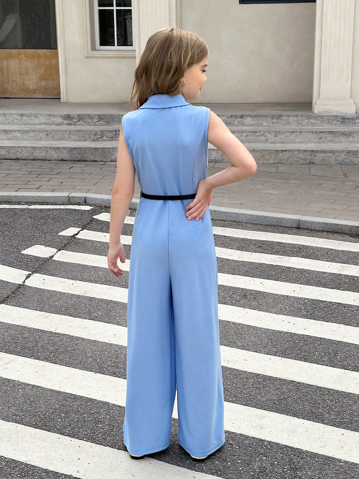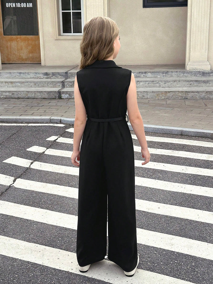 Tween Girls Solid Color Woven Sleeveless Jumpsuit With Revere Collar