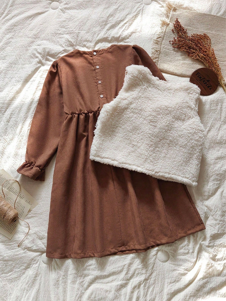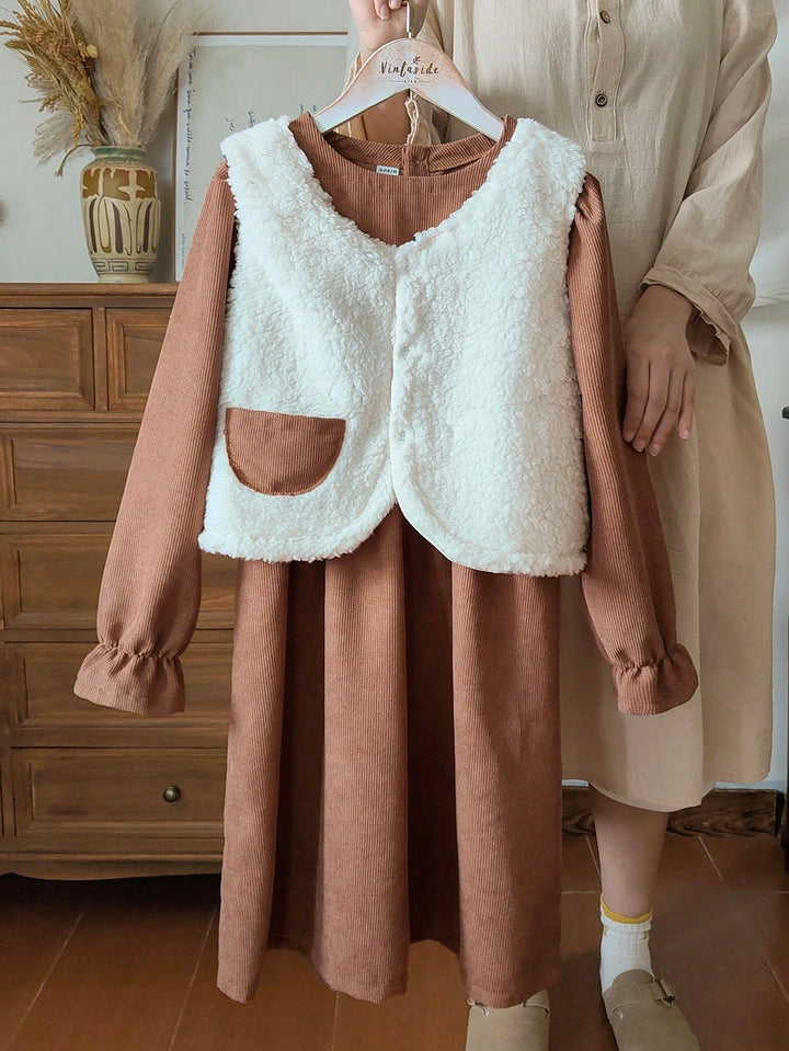 Vintaside Kids Girls Brown Long Sleeve Casual Dress With White Vest Set