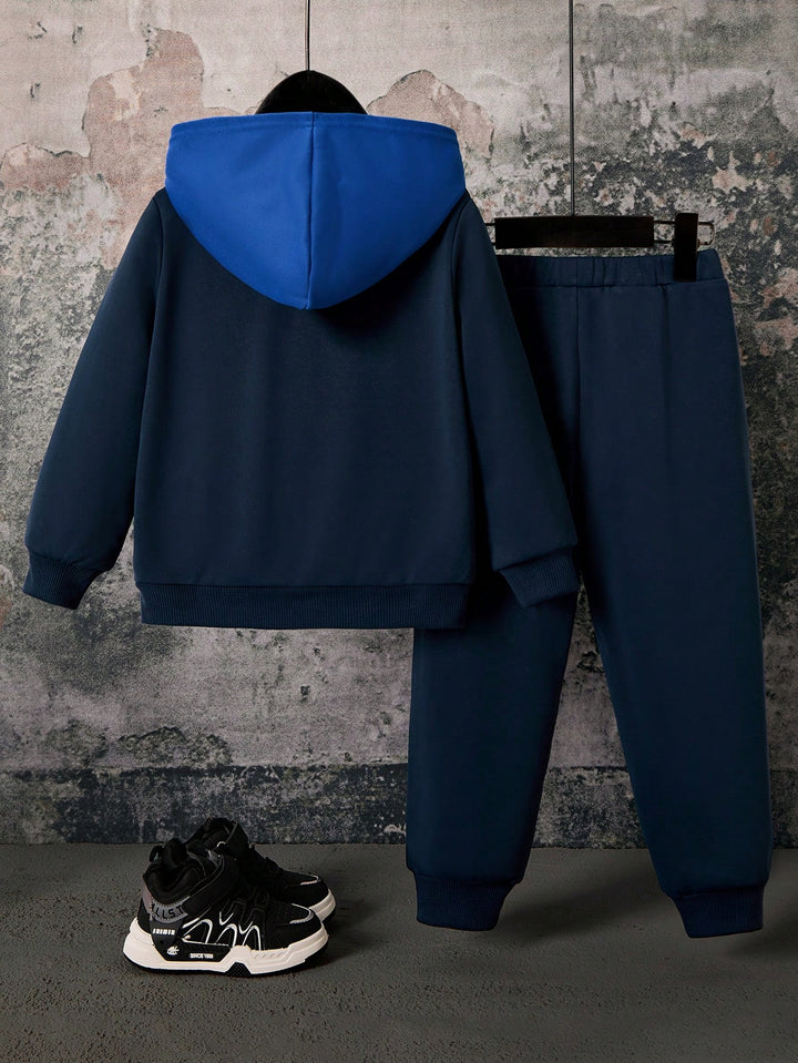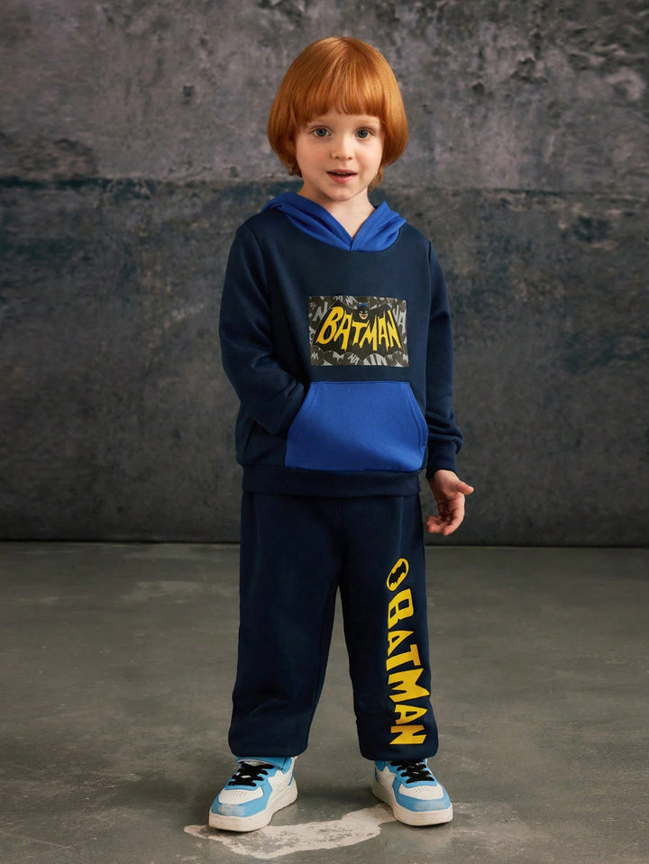 Young Boy Cartoon Bat Print Contrast Color Pocket Hooded Sweatshirt And Pants