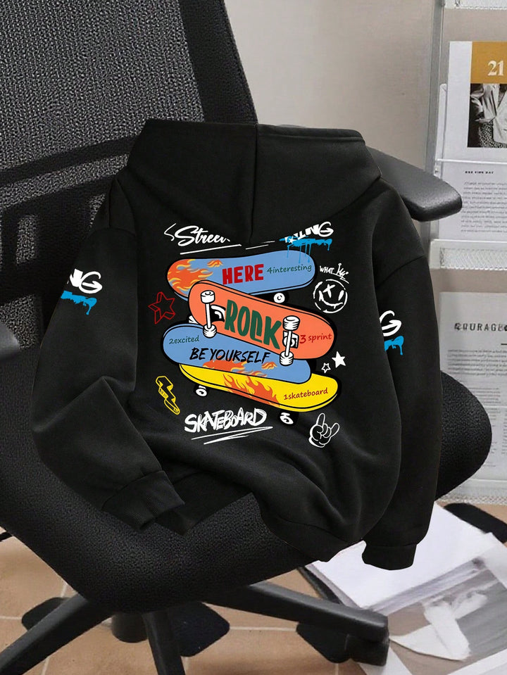 Young Boy Cartoon Skateboard Pattern Warm Hoodie