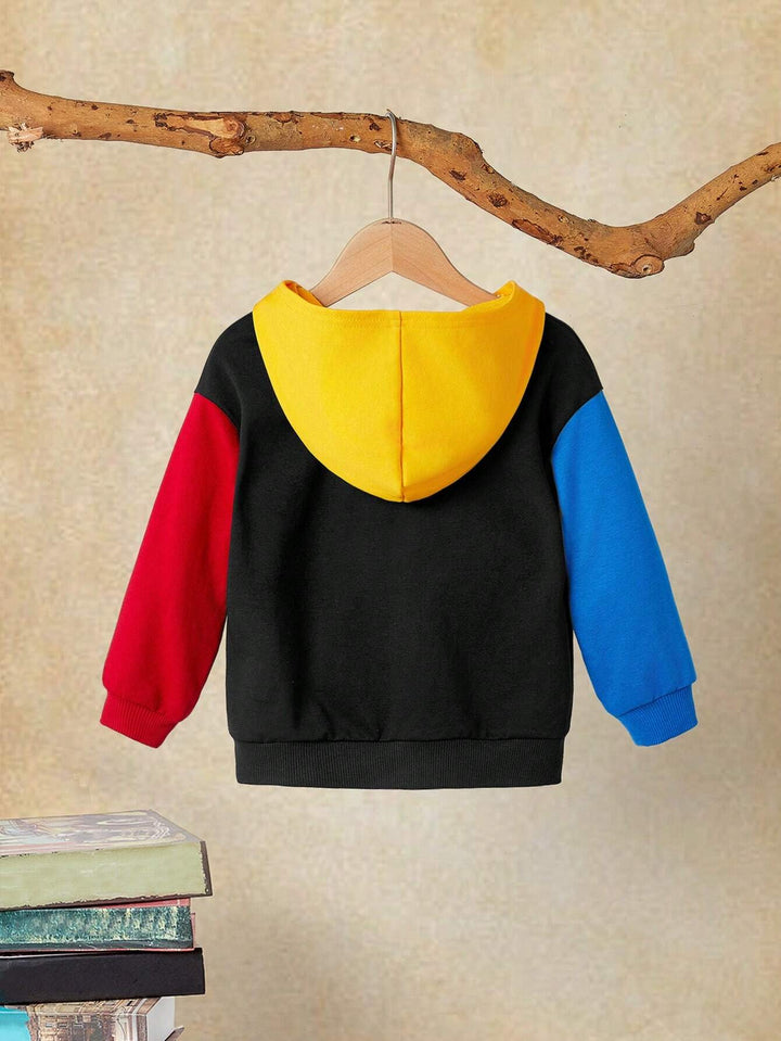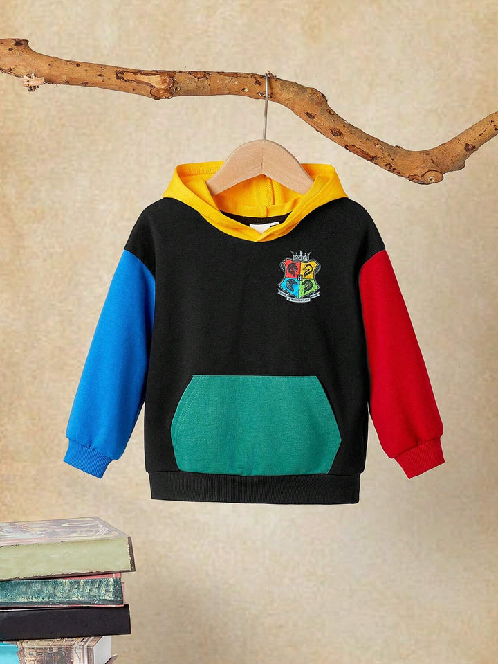 Young Boy Hogwarts Badge Print Casual Color Block Hooded Black Sweatshirt