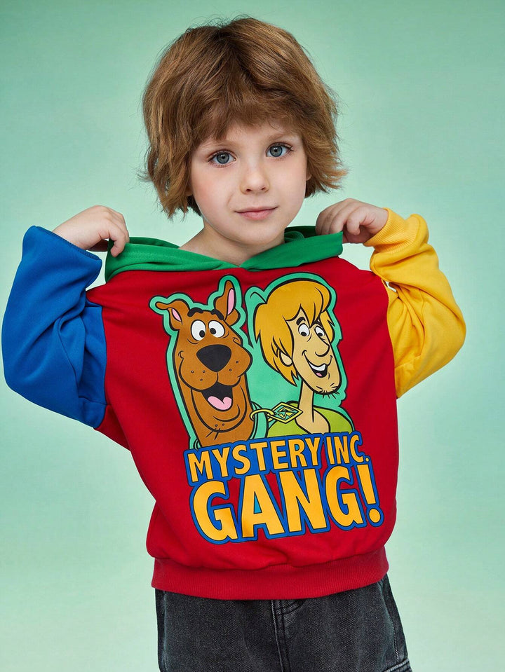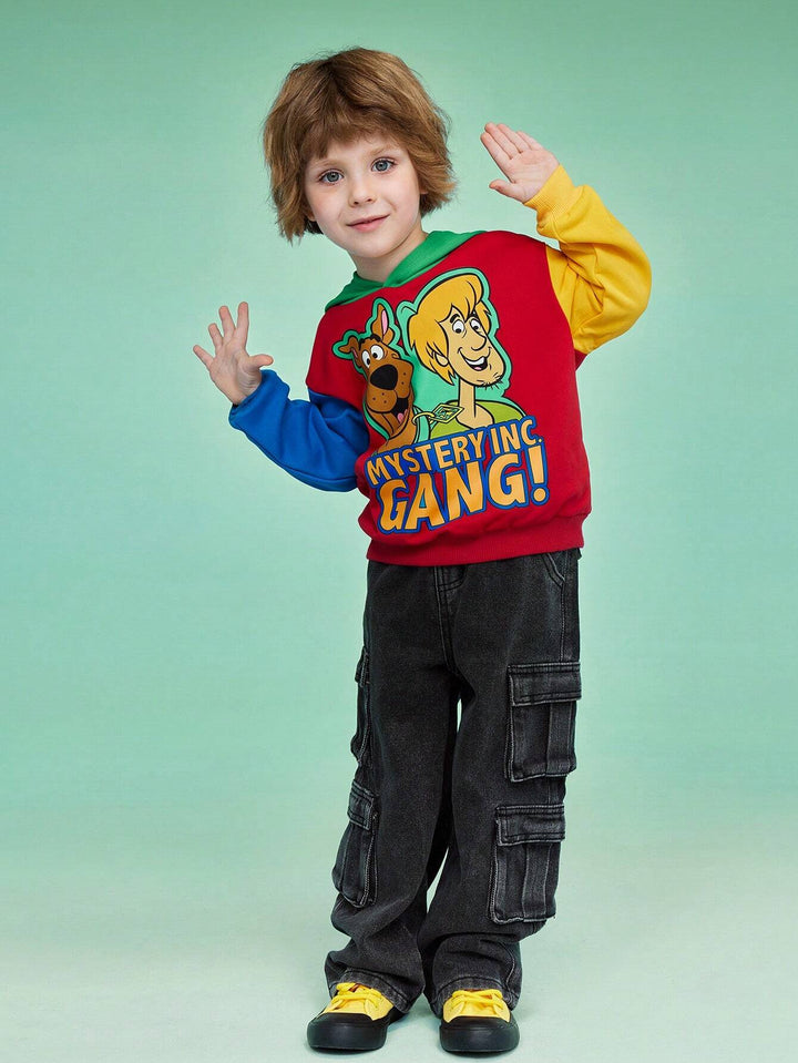 Young Boy Sports Casual Cartoon Dog Print Color Block Loose Fit Hooded Sweatshirt